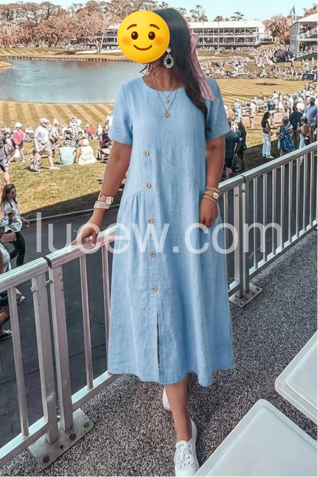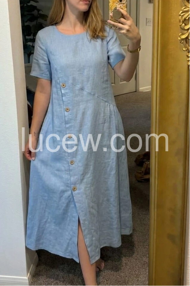 This flowing maxi dress features a soft blue linen fabric with a side button detail and front slit. Short sleeves and round neckline offer a simple, comfortable look. Functional pockets add practicality. Ideal for warm days or casual outings. Timeless style with a bohemian touch.
