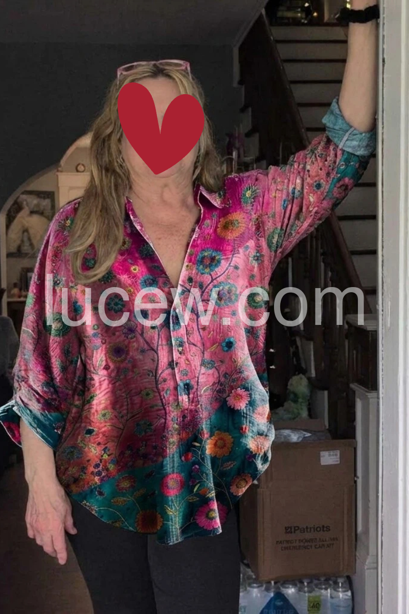 This long-sleeve shirt features a colorful floral print with a bold purple and teal color block design. The relaxed fit and classic collar offer effortless style. Perfect for pairing with jeans or denim shorts. Ideal for bohemian-inspired looks. Lightweight and eye-catching for casual days.