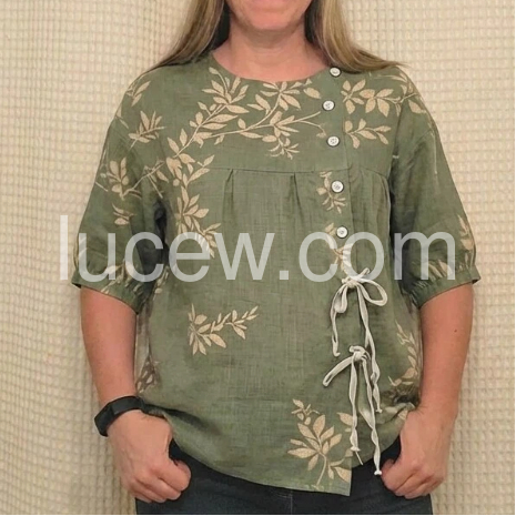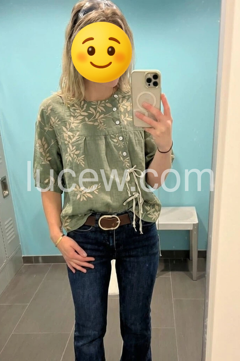 This loose-fit top features a soft olive green base with delicate leaf patterns. Front button-down design and side ties add a stylish touch. Short sleeves with rolled cuffs for comfort. Lightweight fabric perfect for casual wear. Effortlessly chic with a boho-vibe.