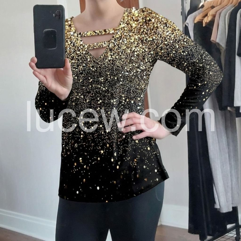 Just in time for your next glam holiday vacay! This sultry, strappy caged shirt has a v-neckline that awaits your favorite layering necklaces or statement jewels. This unique long-sleeved top sparkles with a generous sprinkle of metallic ombre silver and gold print, perfect for pairing with jeans or black slacks, boots, and metallic heels. Machine wash cold tumble dry low to medium heat. Iron if needed or lay flat to dry.