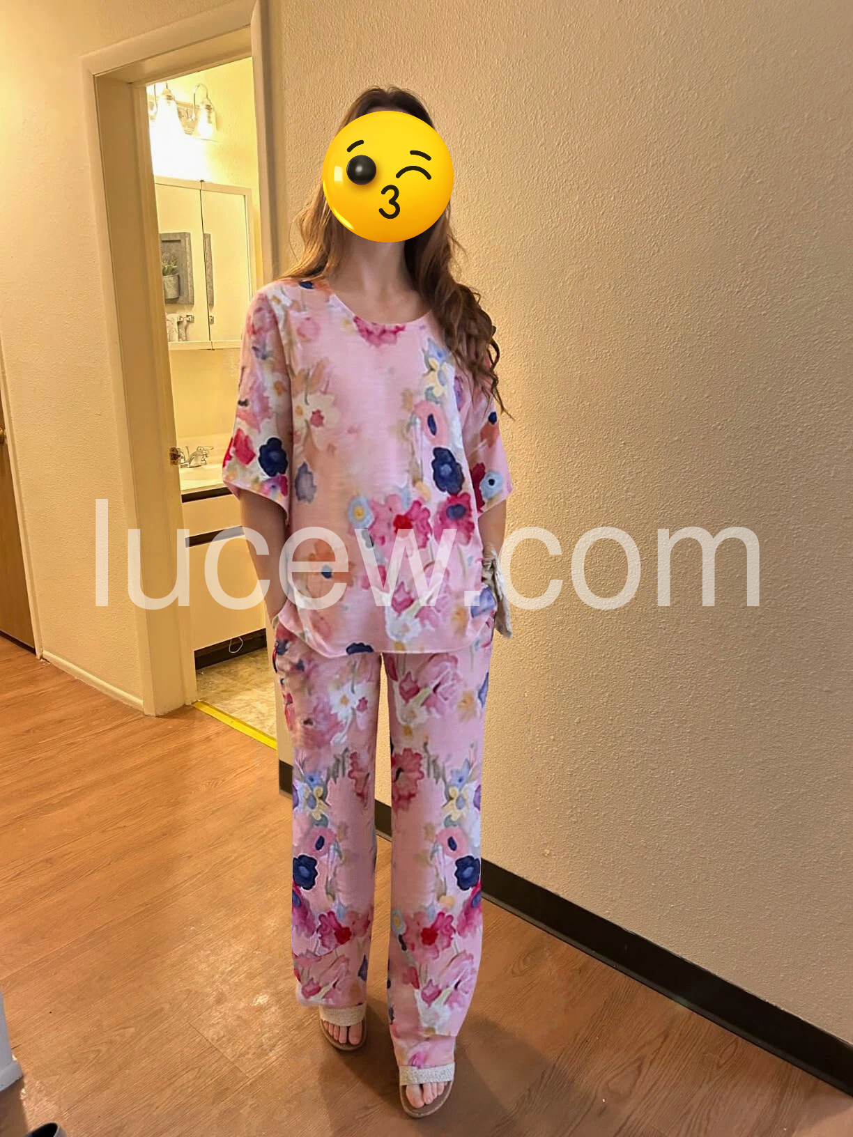 This floral two-piece set features a soft pink base with vibrant watercolor blooms in red, blue, and yellow. The relaxed-fit top has short flutter sleeves and a round neckline. Matching wide-leg pants offer comfort and ease. Perfect for casual outings or warm-weather days. Lightweight fabric ensures breathability and effortless style.