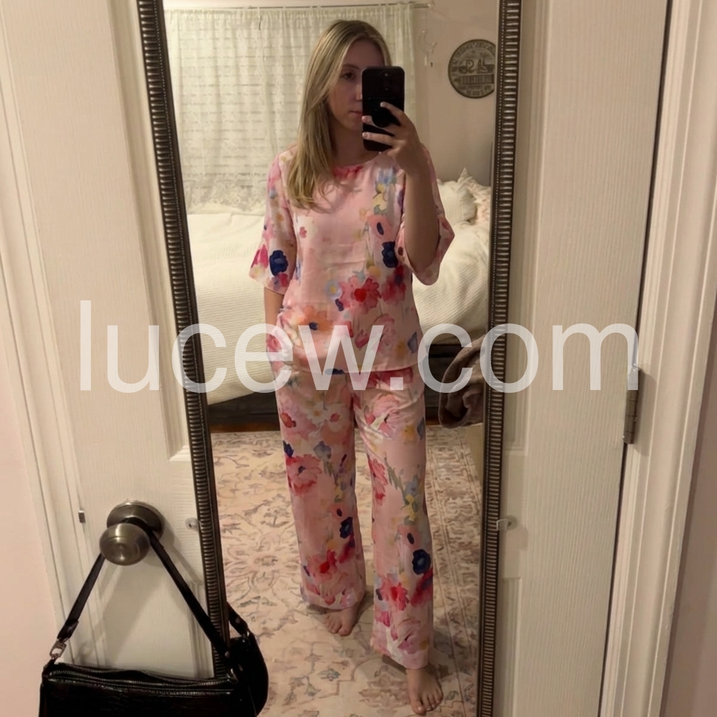 I bought this set for an upcoming cruise and it is absolutely perfect. The material is so lightweight and breathable, making it ideal for tropical weather. The pink floral pattern is vibrant and exactly as pictured. I received so many compliments walking around the ship. Highly recommend!