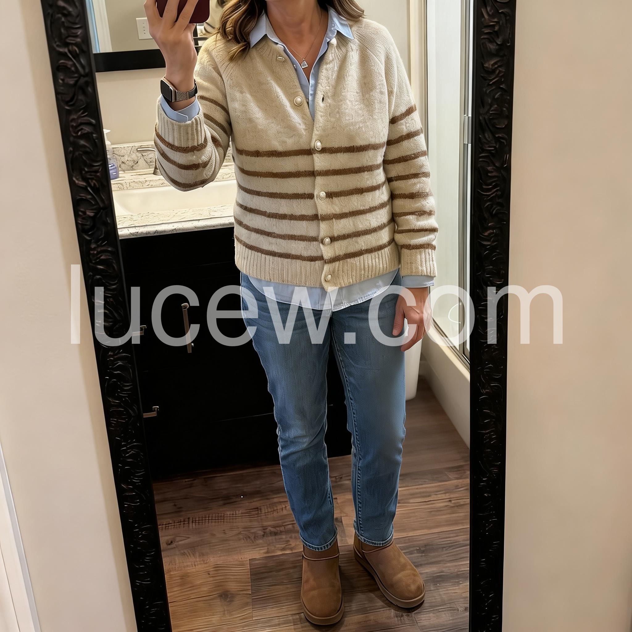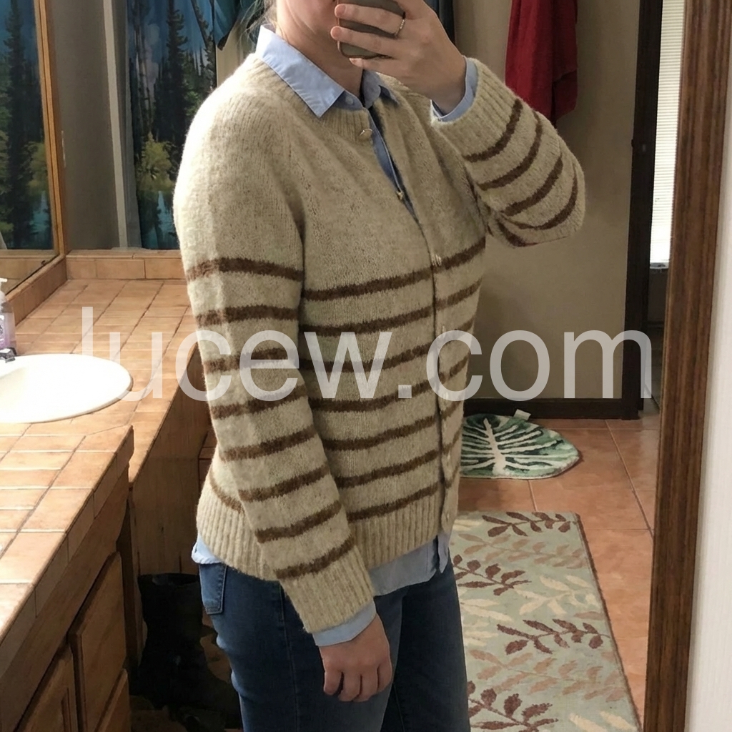This Apricot Long Sleeve Striped Cardigan is a versatile addition to any wardrobe. Perfect for cooler days, it features a timeless striped design and long sleeves for added warmth. Made from high-quality materials, it's both comfortable and stylish, making it the perfect option for everyday wear. With its classic design and practical features, this cardigan is a must-have for any fashion-forward individual.