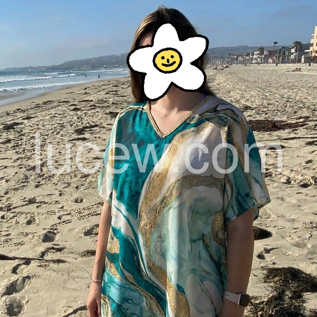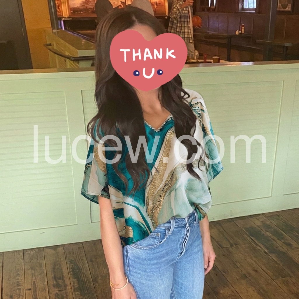 This loose-fitting top features a bold emerald, gold, and cream abstract design. V-neckline with delicate trim for added detail. Wide sleeves and relaxed silhouette for effortless comfort. Perfect for warm days or beachwear. Stylish and easy to pair with pants or shorts.