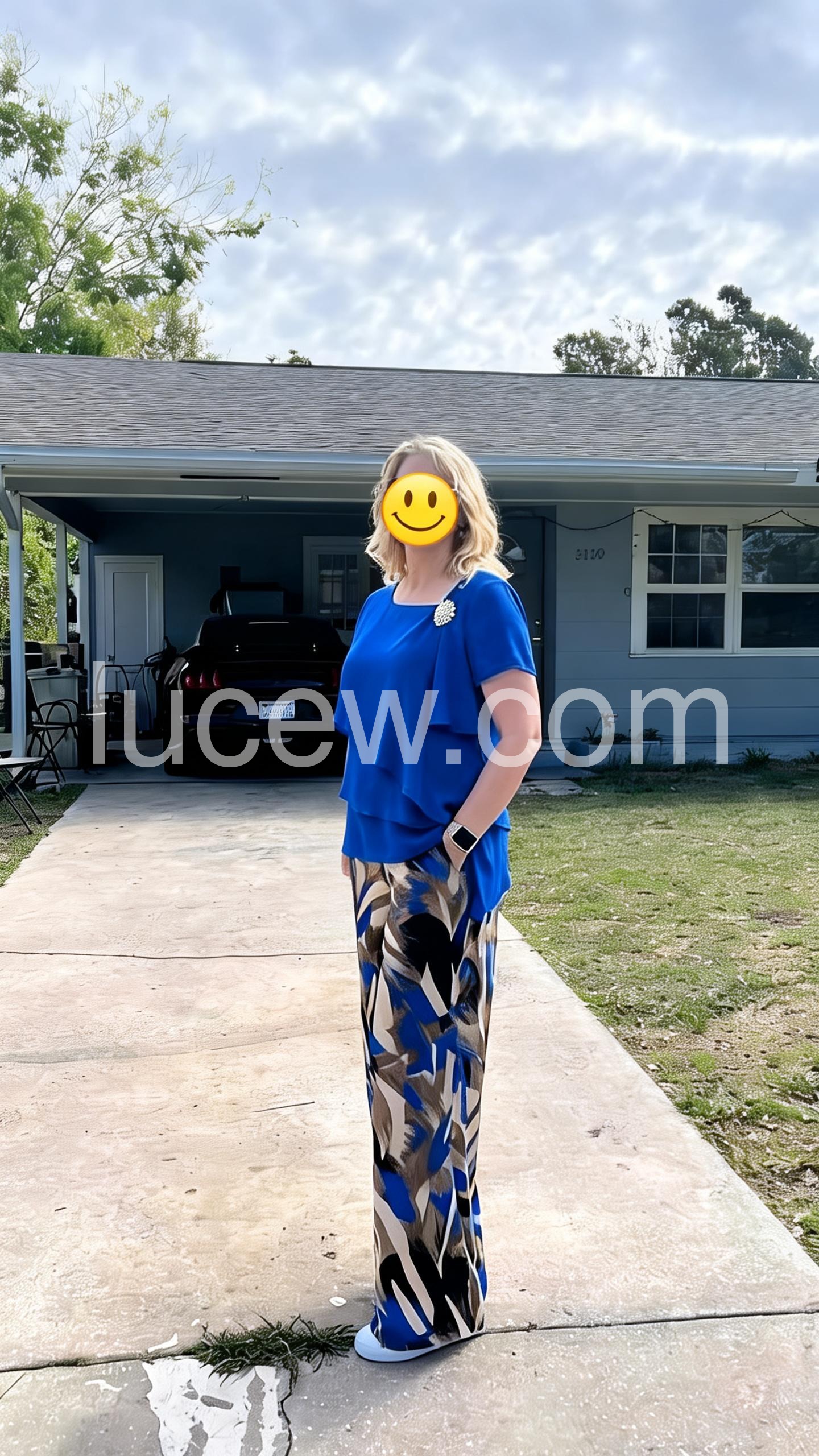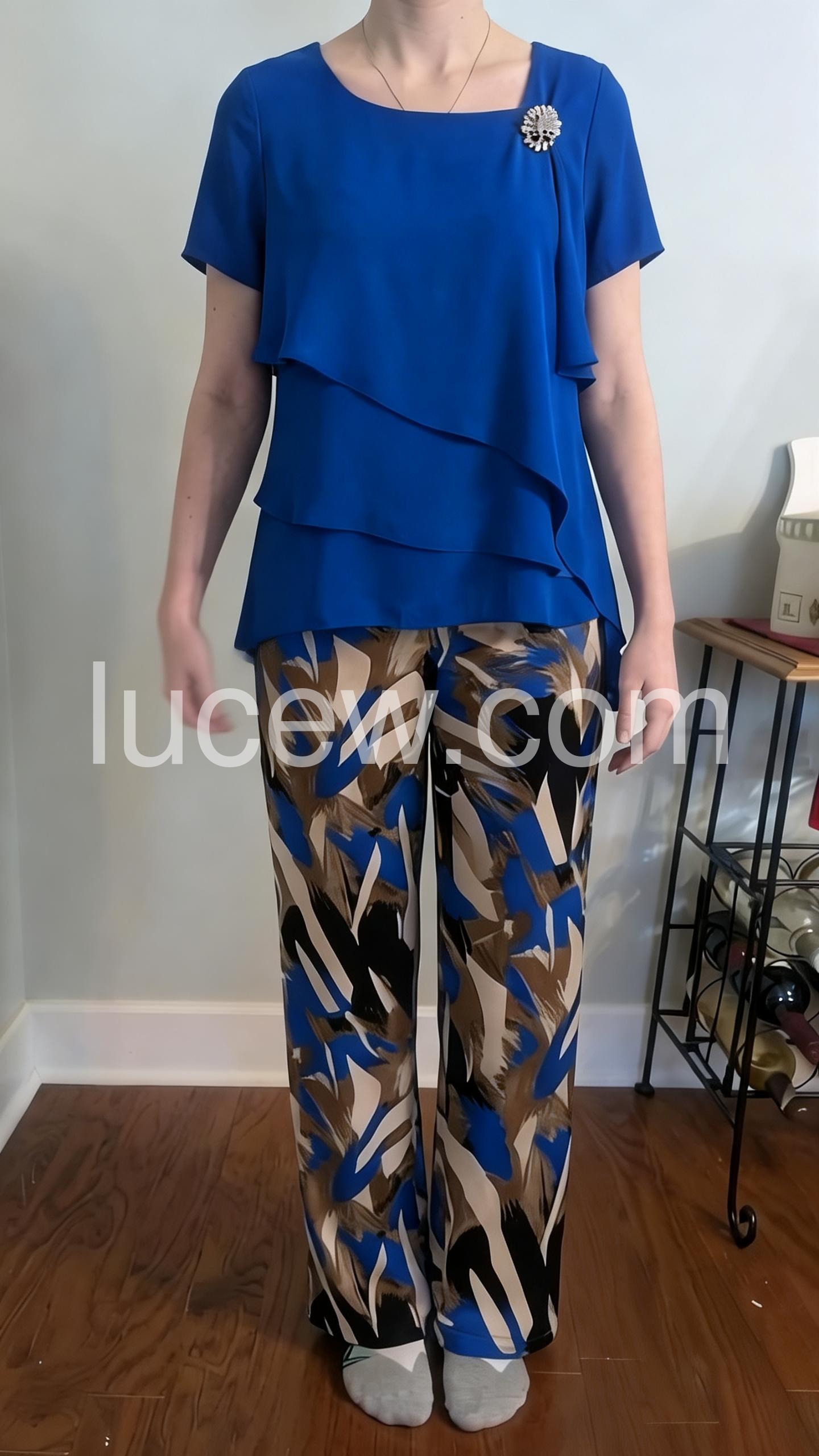 This coordinated set features a vibrant blue top with an asymmetrical layered hem and matching wide-leg pants in a bold abstract print. The combination of solid and patterned pieces creates a stylish contrast. Lightweight fabric perfect for warm weather. Ideal for casual outings or relaxed elegance. Effortlessly chic and fashion-forward.