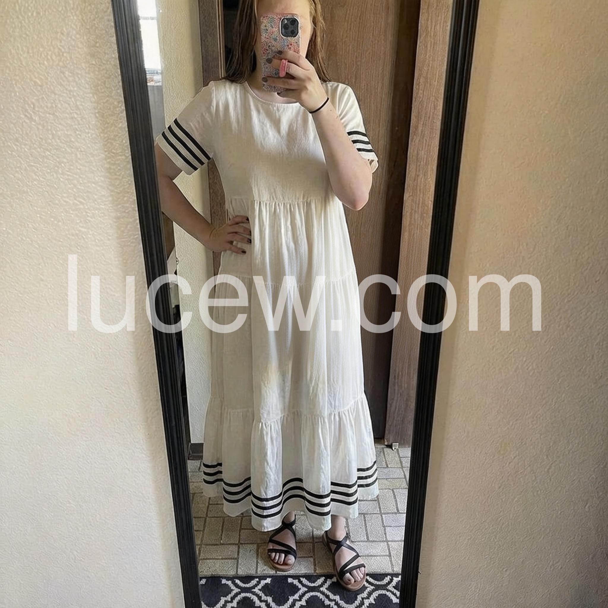 Love the black stripe detailing on the sleeves and hem! It gives a classic nautical vibe. The tiered skirt is so flattering and forgiving. Highly recommend for summer.
