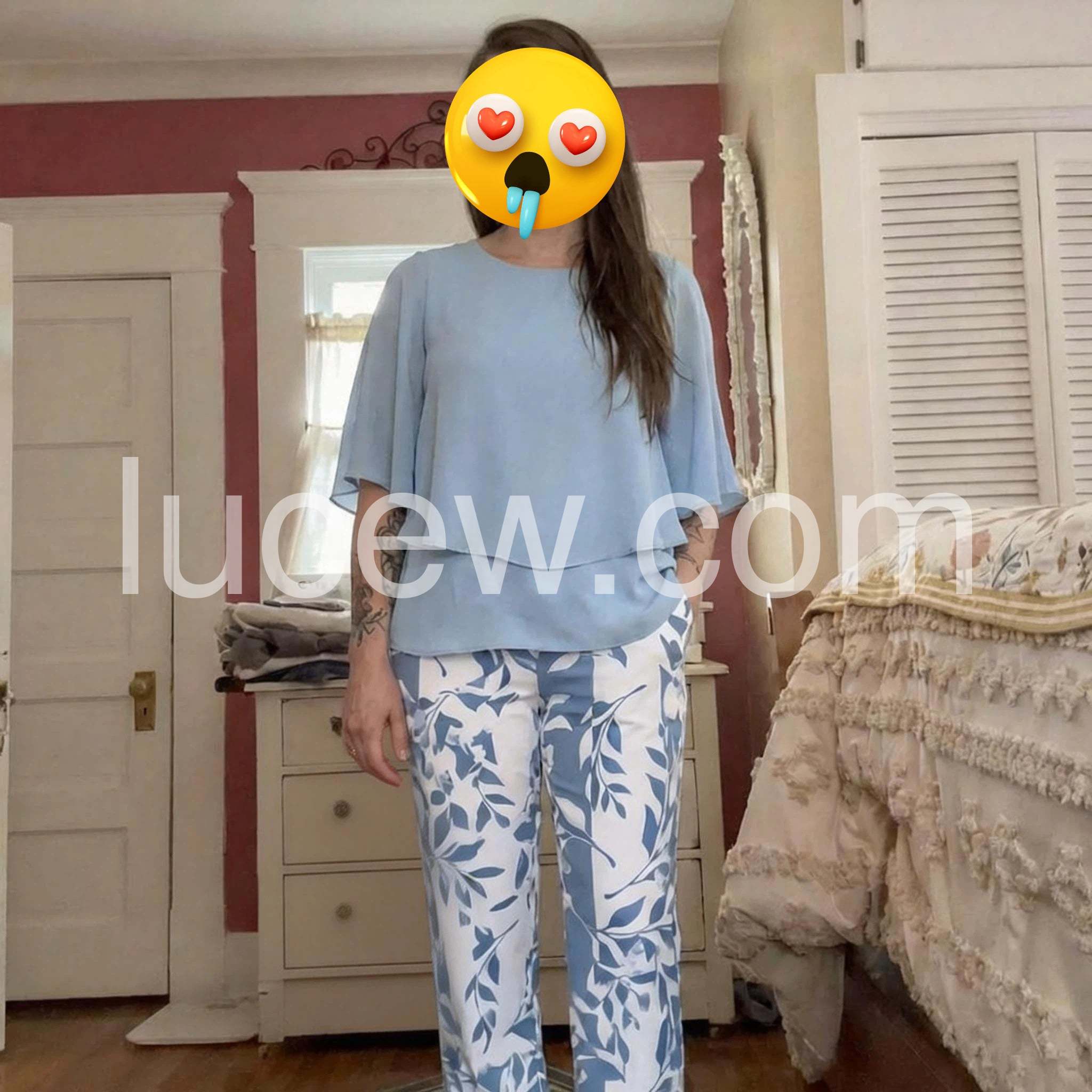 I wore this two-piece set on a recent cruise and received so many compliments! The light blue color is stunning, and the layered top perfectly hides any tummy insecurities. The pants are incredibly comfortable and flowy. Highly recommend for any summer vacation.