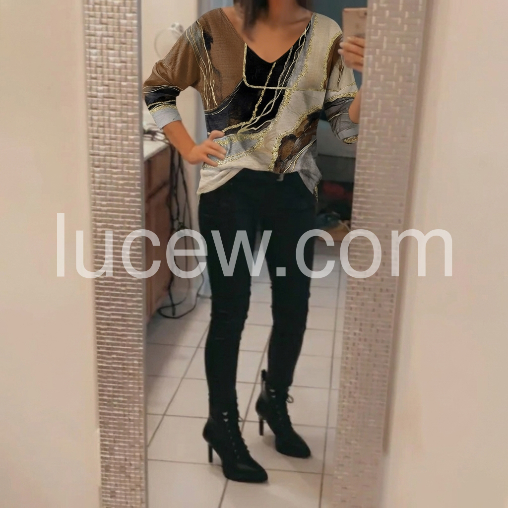This loose-fitting top features a bold abstract design in earthy tones with gold accents. Deep V-neckline and long sleeves for a relaxed look. Lightweight fabric perfect for casual wear. Stylish and easy to pair with pants or skirts. Effortlessly chic for everyday style.