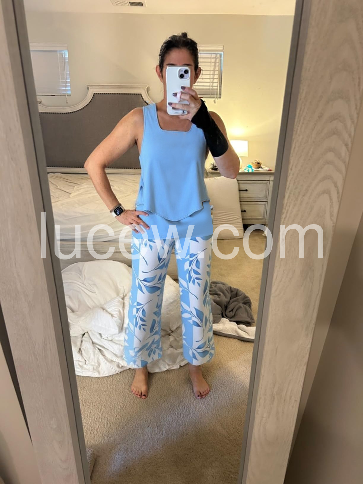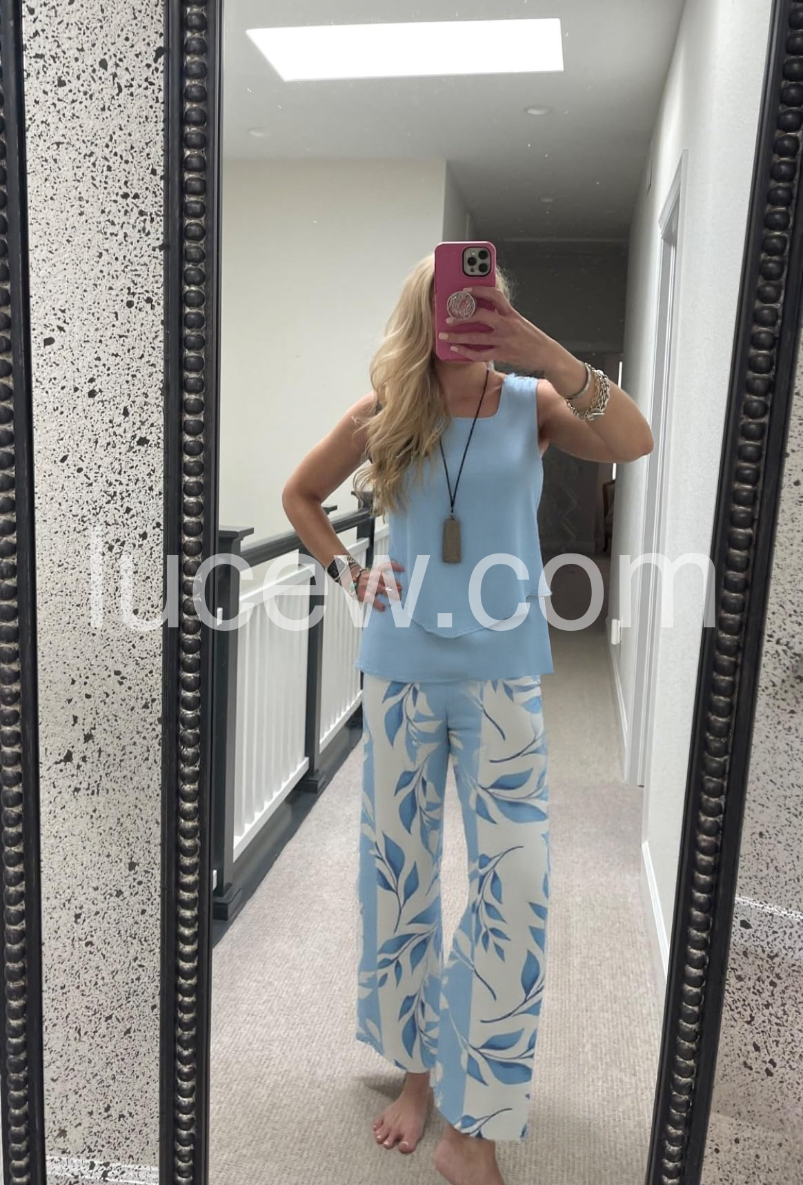 This two-piece set is my new summer staple. The layered top is very flattering and hides my tummy perfectly, while the pants have a comfortable elastic waist that doesn't dig in. The blue leaf pattern is even prettier in person. I just pair it with some sandals and a straw hat and I am good to go. True to size!