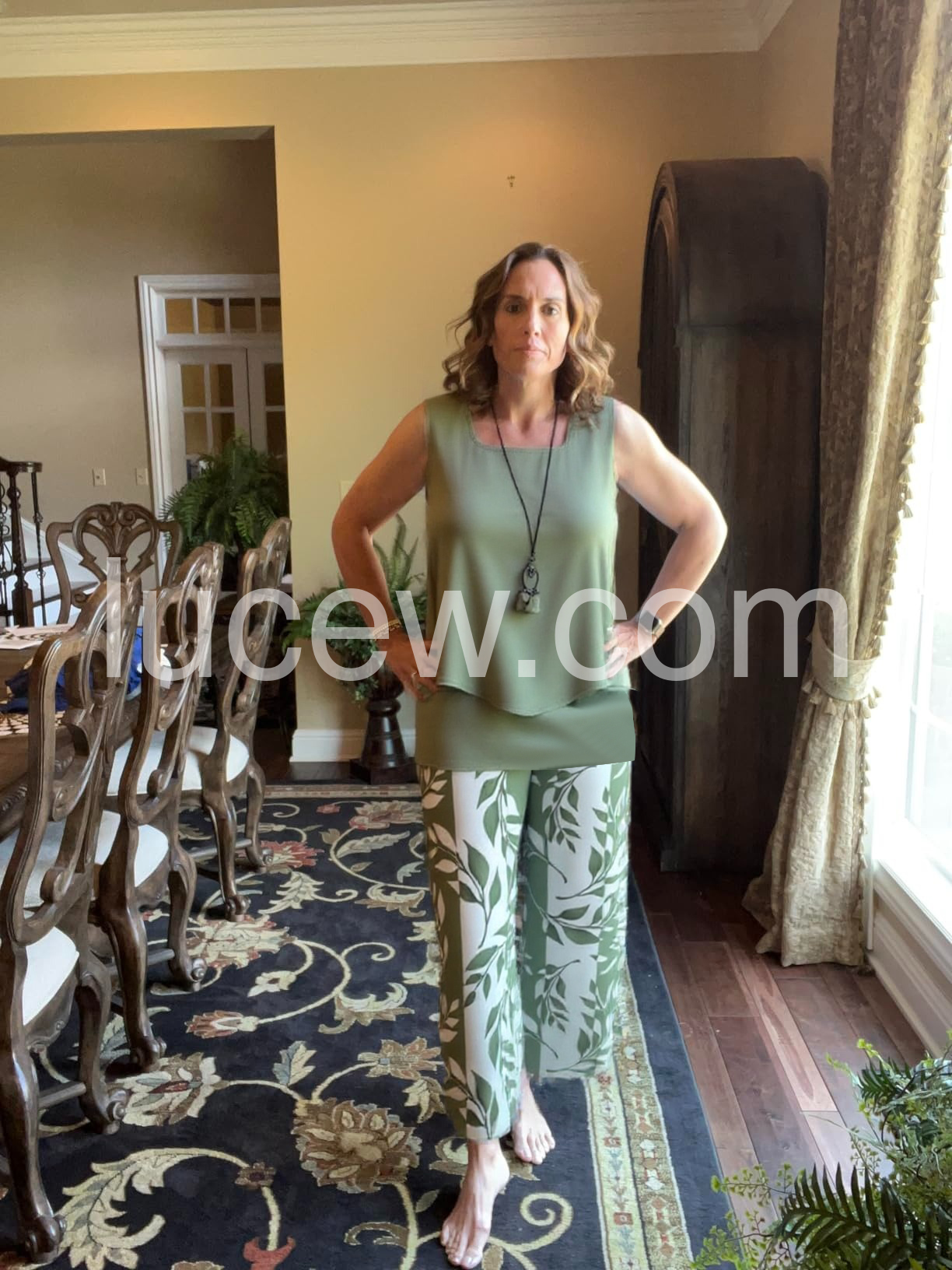This outfit is a pleasant surprise. The olive green color matches the picture exactly. I was worried the pants might be too long, but they hit right at the ankle for me. The layered top hides my tummy perfectly. Highly recommend!