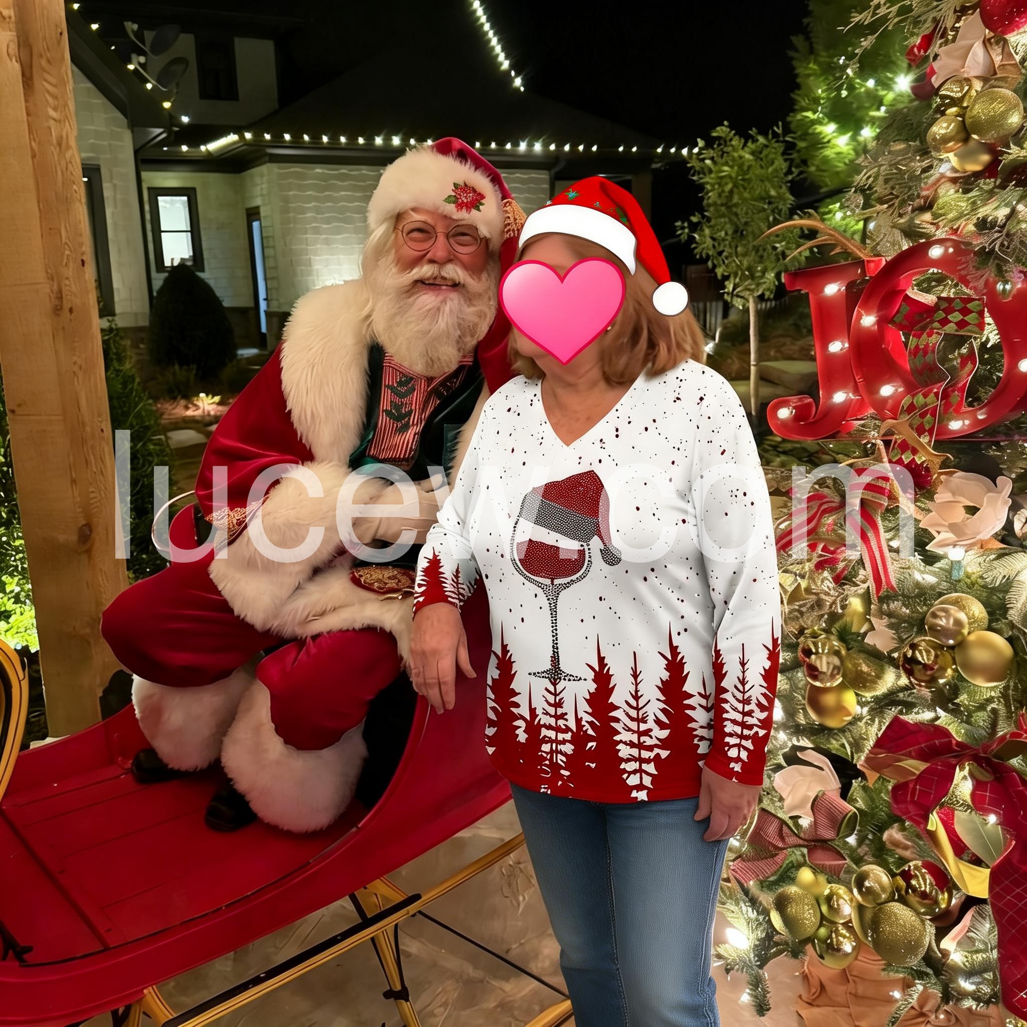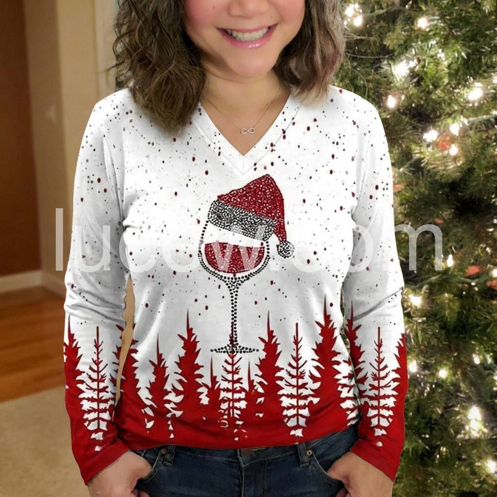 Spread holiday cheer with this long sleeve v-neck top! A dotted mosaic creates a tipsy red wine glass Santa Claus hat print, setting a fun and flirty mood for your next Christmas party.  Red pine trees add the perfect backdrop for any time you need a joyful reminder of your favorite time of year.