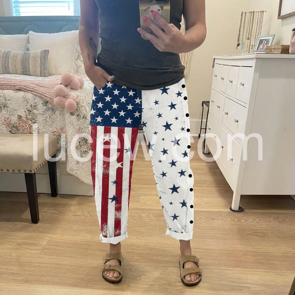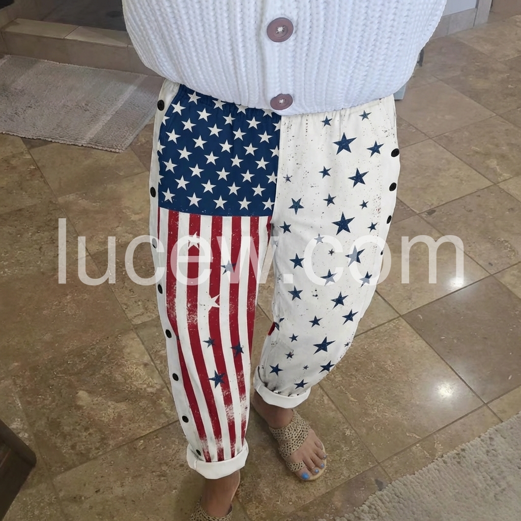 These loose-fit pants feature a bold American flag print with stars and stripes on one leg. Side button details add a unique touch. Elastic waistband and cuffed hems for comfort. Lightweight fabric perfect for casual wear. Ideal for summer outings or festive occasions.