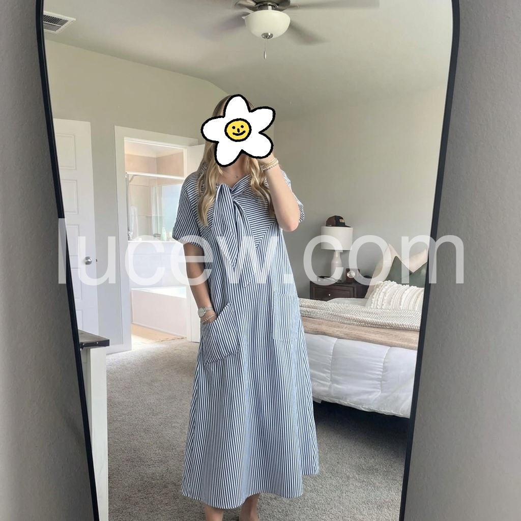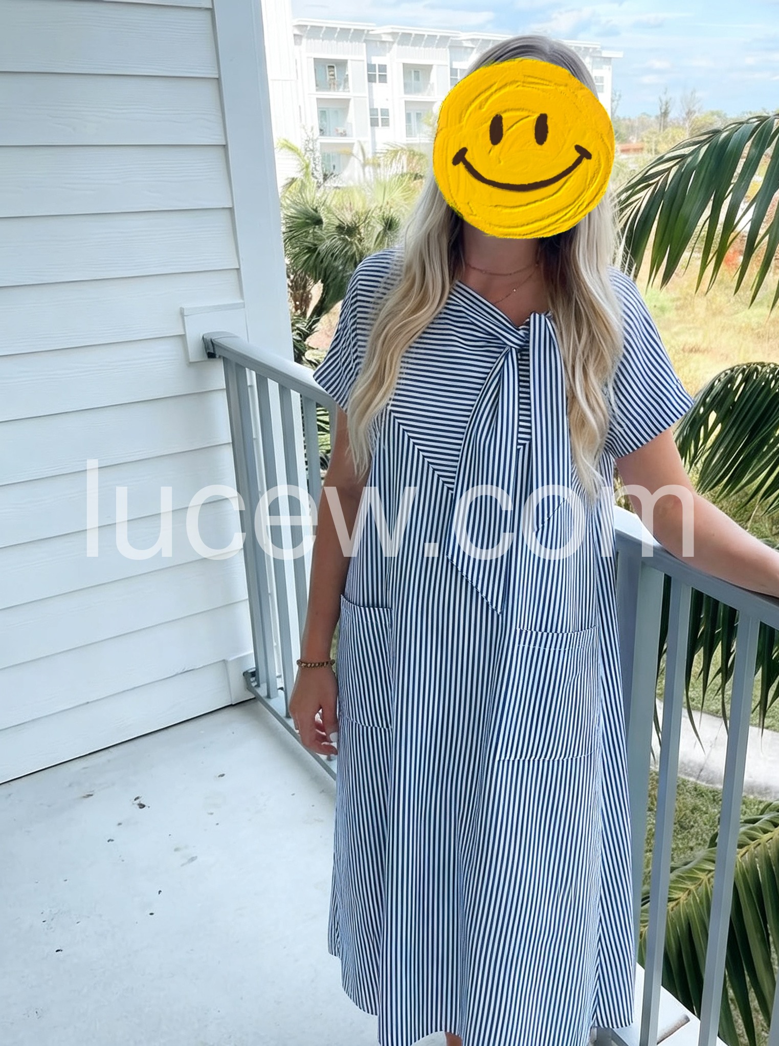 The classic blue-and-white vertical stripe print, twisted neck detail, and oversized pockets create a relaxed, chic silhouette.