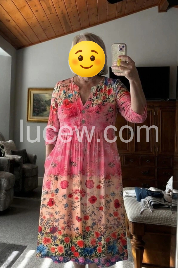 This midi dress features a vibrant floral print with a soft pink gradient and bold blooms. The V-neckline and three-quarter sleeves offer a flattering, relaxed fit. Side pockets add practicality and ease. Flowy A-line silhouette enhances movement. Perfect for garden parties or casual summer days.