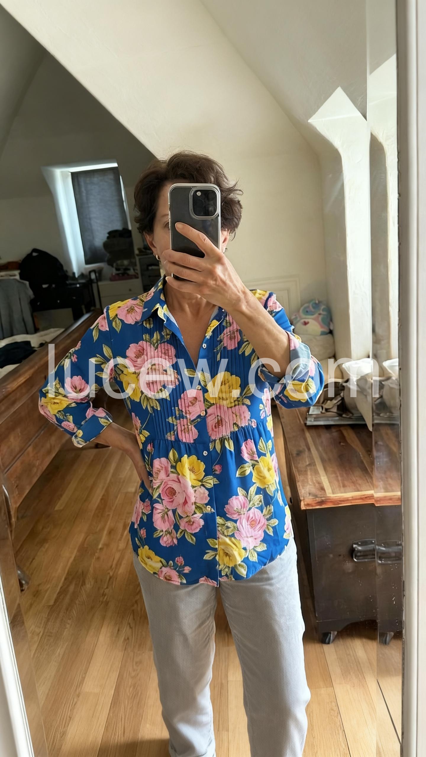 This has quickly become my go-to blouse. The blue really pops, and the yellow and pink roses are stunning. It washes well and does not wrinkle easily.