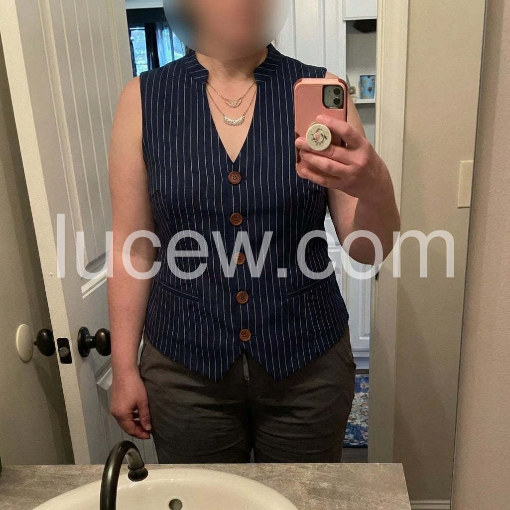 This striped button-down vest is a wardrobe staple now. It is incredibly slimming because of the vertical stripes and the fitted cut. Fits exactly as described on the sizing chart.
