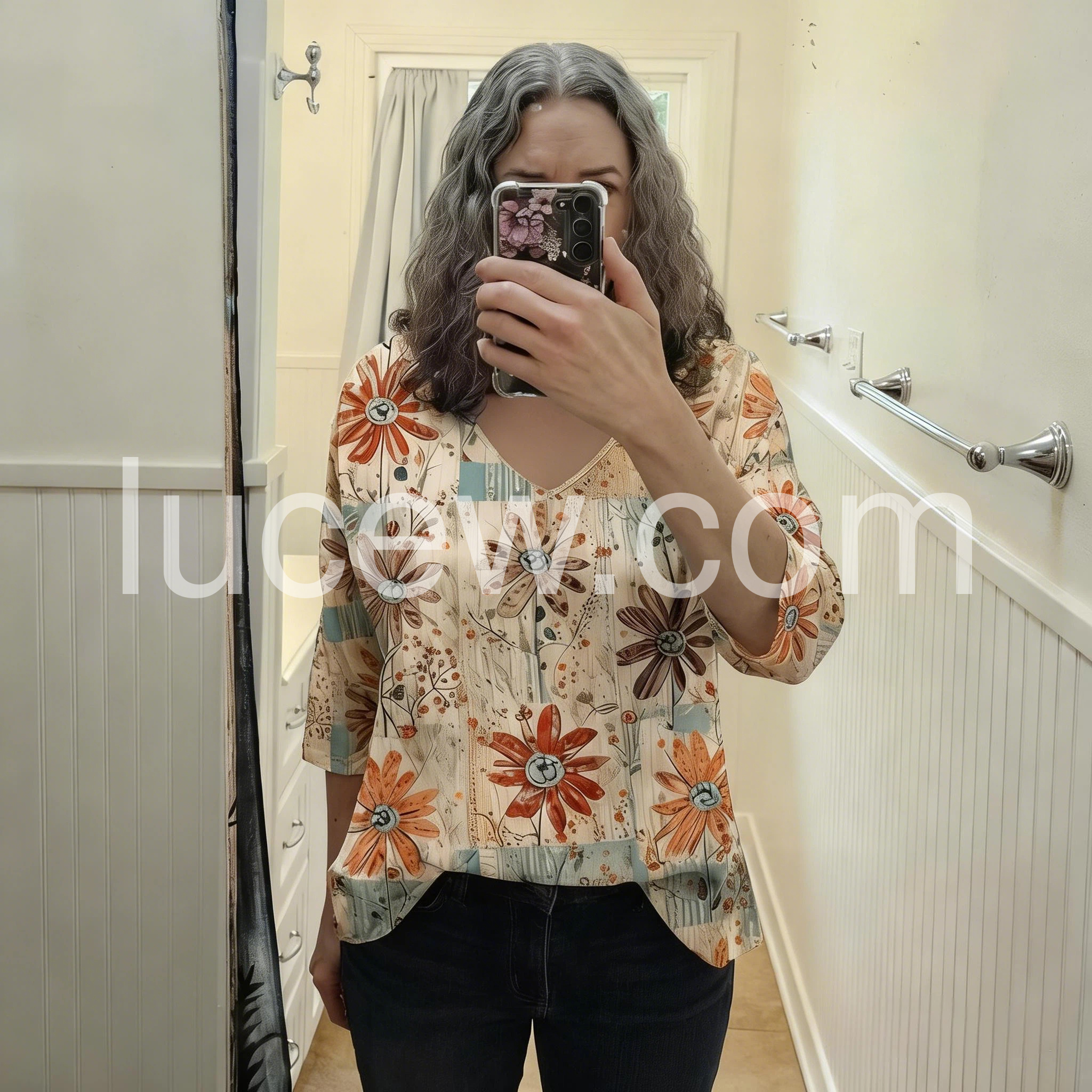 Patchwork Floral Print V-Neck 3/4 Sleeve Blouse