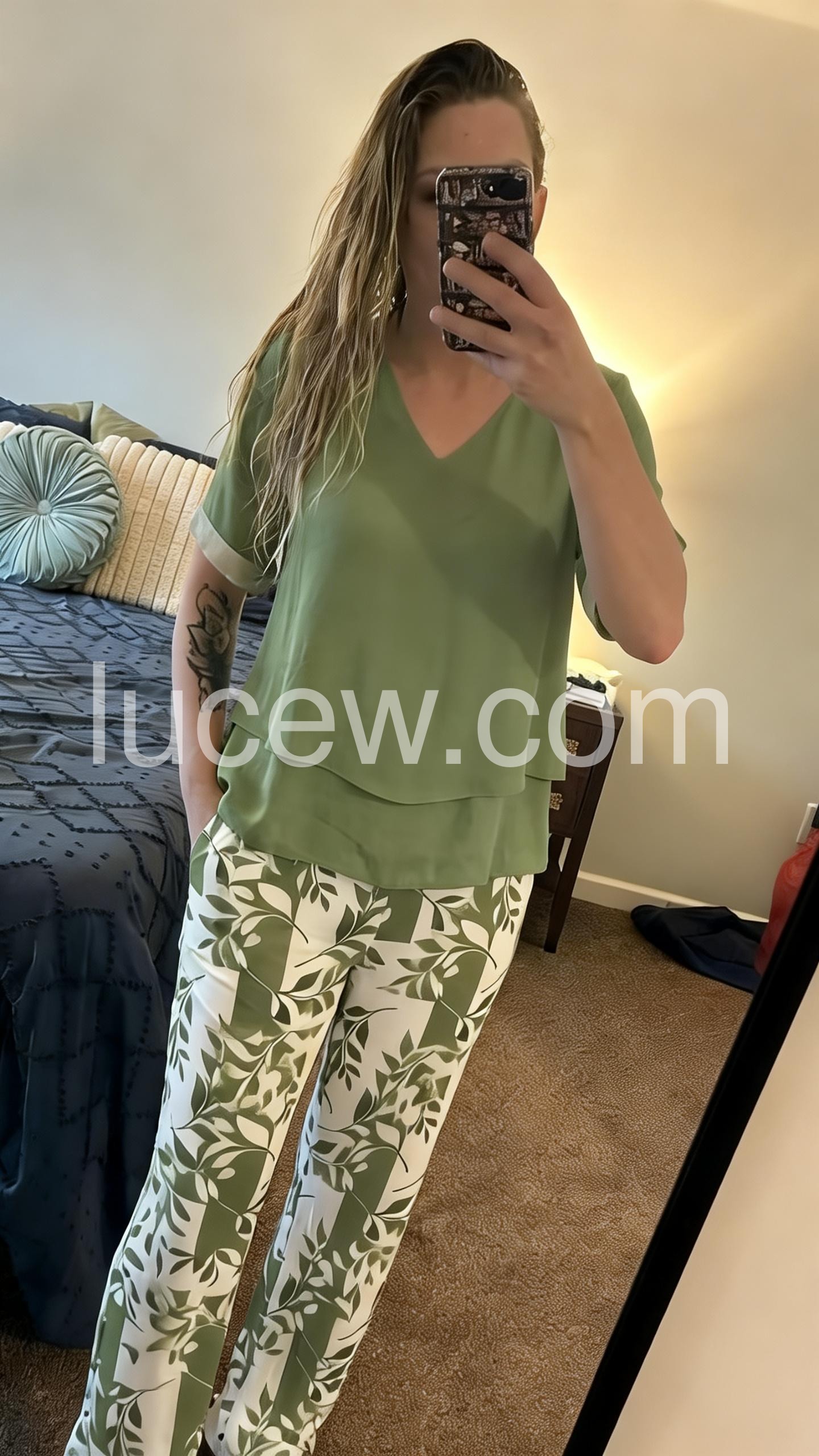 This coordinated set features a solid green V-neck top with a layered hem and rolled sleeves. Paired with white pants in a leafy green pattern for a natural, airy look. Lightweight fabric perfect for casual wear. Ideal for everyday comfort or light outings. Effortlessly stylish and easy to wear.