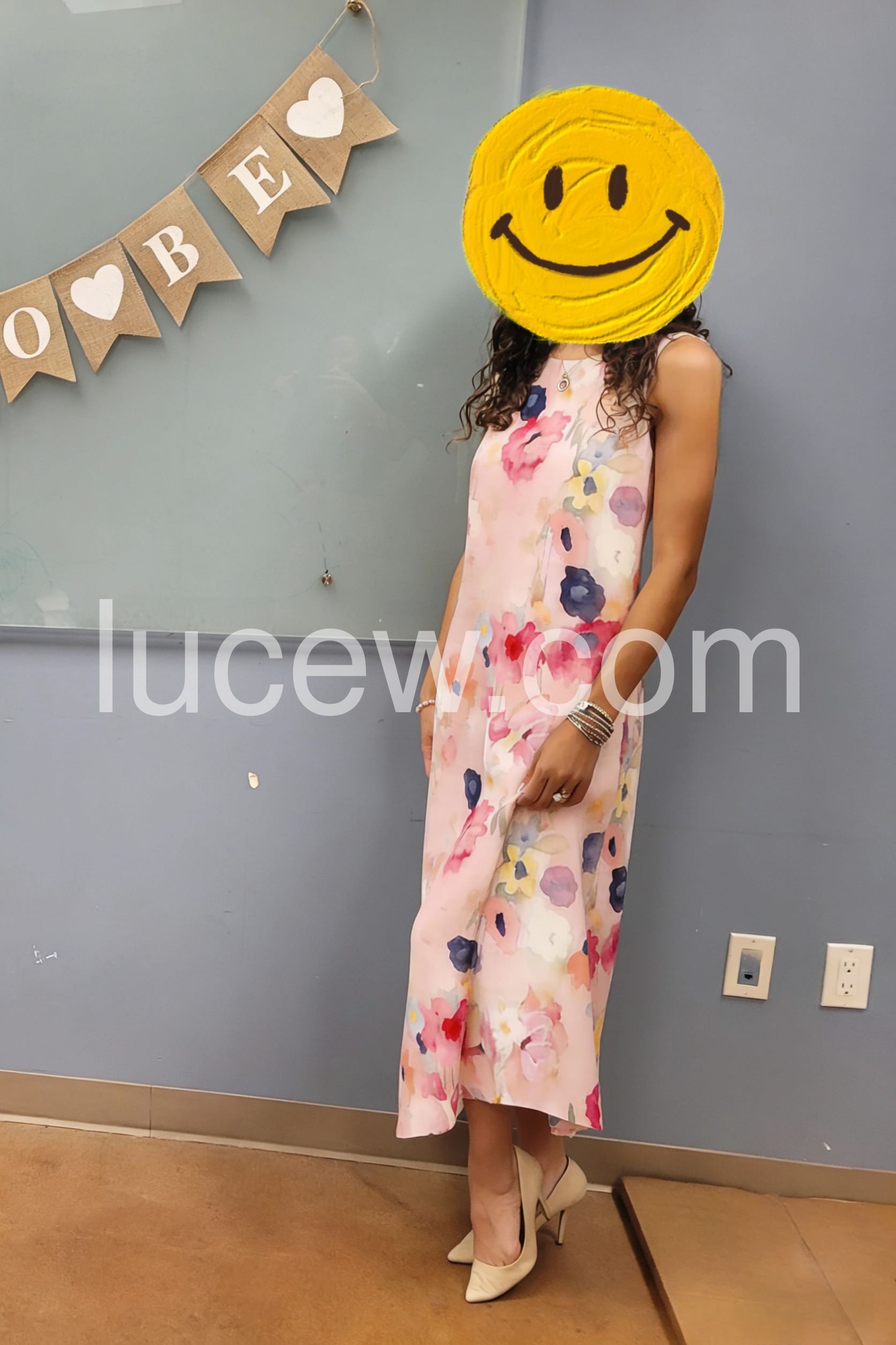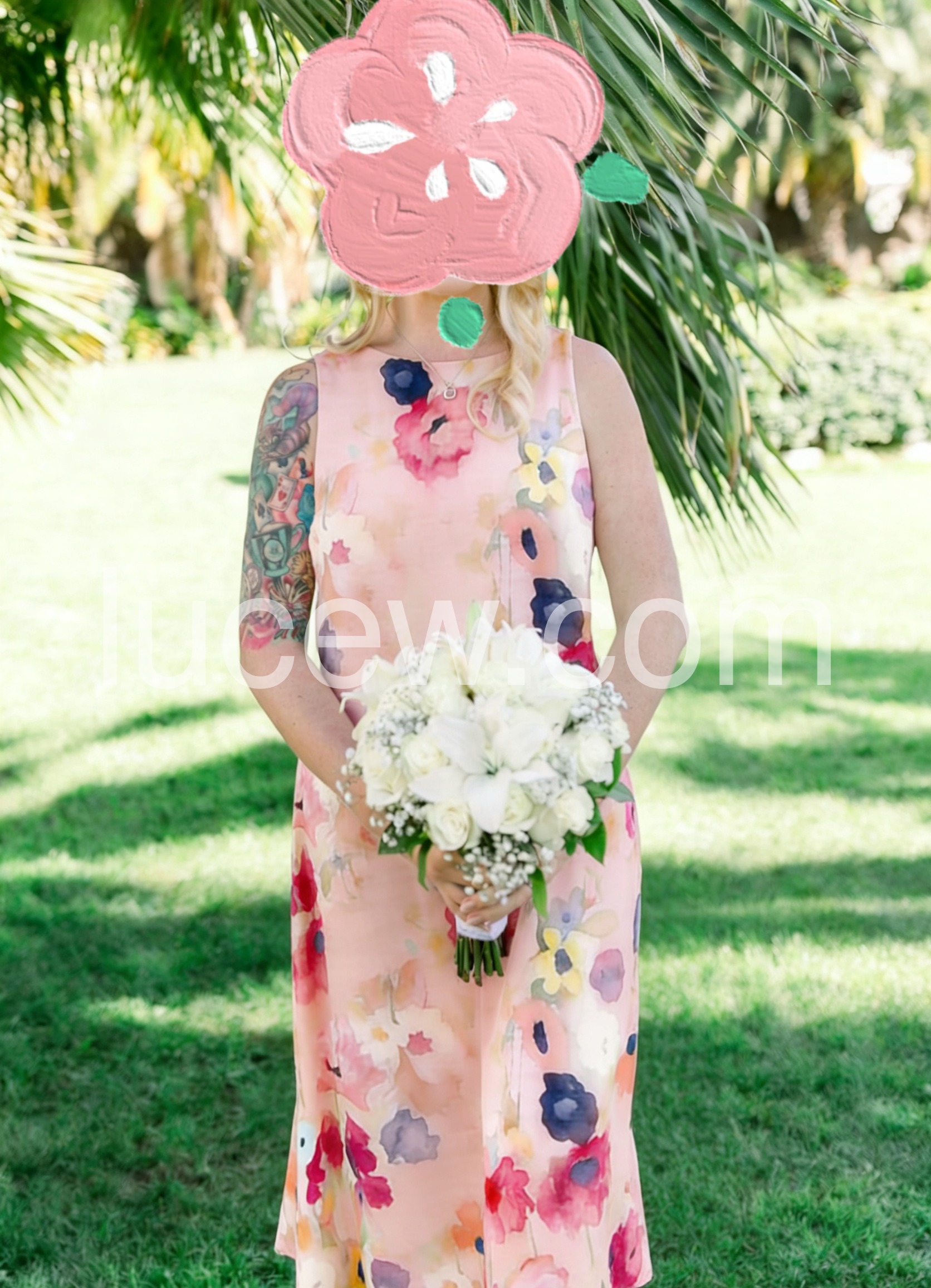 This sleeveless midi dress features a soft pink base with vibrant watercolor floral prints. The round neckline and flowy silhouette create a feminine look. Perfect for summer outings or resort wear. Lightweight fabric for comfort and ease. Ideal for casual elegance by the pool or beach.