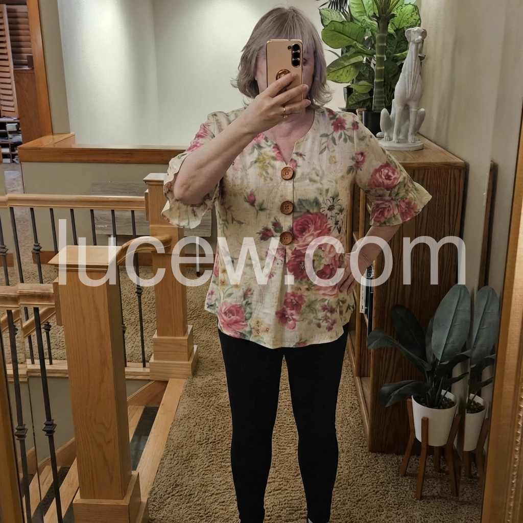 This lightweight blouse features a soft floral print with pink roses on a cream base. V-neckline with wooden buttons down the front. Flared three-quarter sleeves with ruffle details. Perfect for spring or summer outfits. Effortlessly feminine and relaxed.