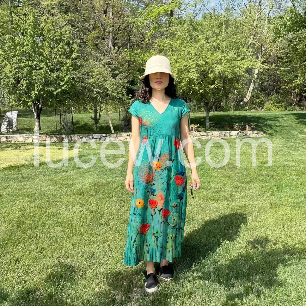 Beautiful dress and extremely comfortable. The fabric feels like a high-quality cotton linen blend that breathes well in warm weather. The v-neck is flattering without being too deep.