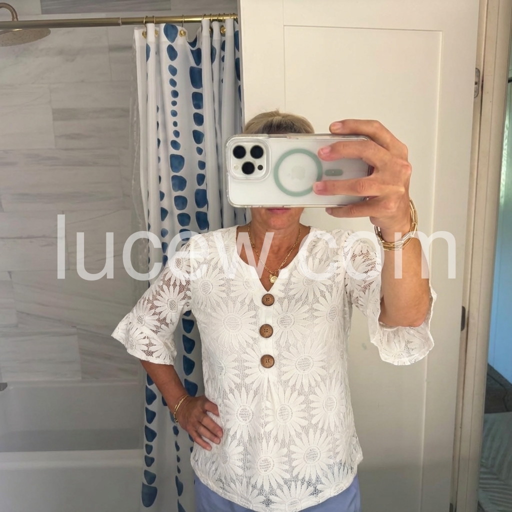 I absolutely love this top! The daisy lace pattern is so cute and perfect for spring. It fits true to size and looks great with my favorite pair of jeans. Highly recommend!