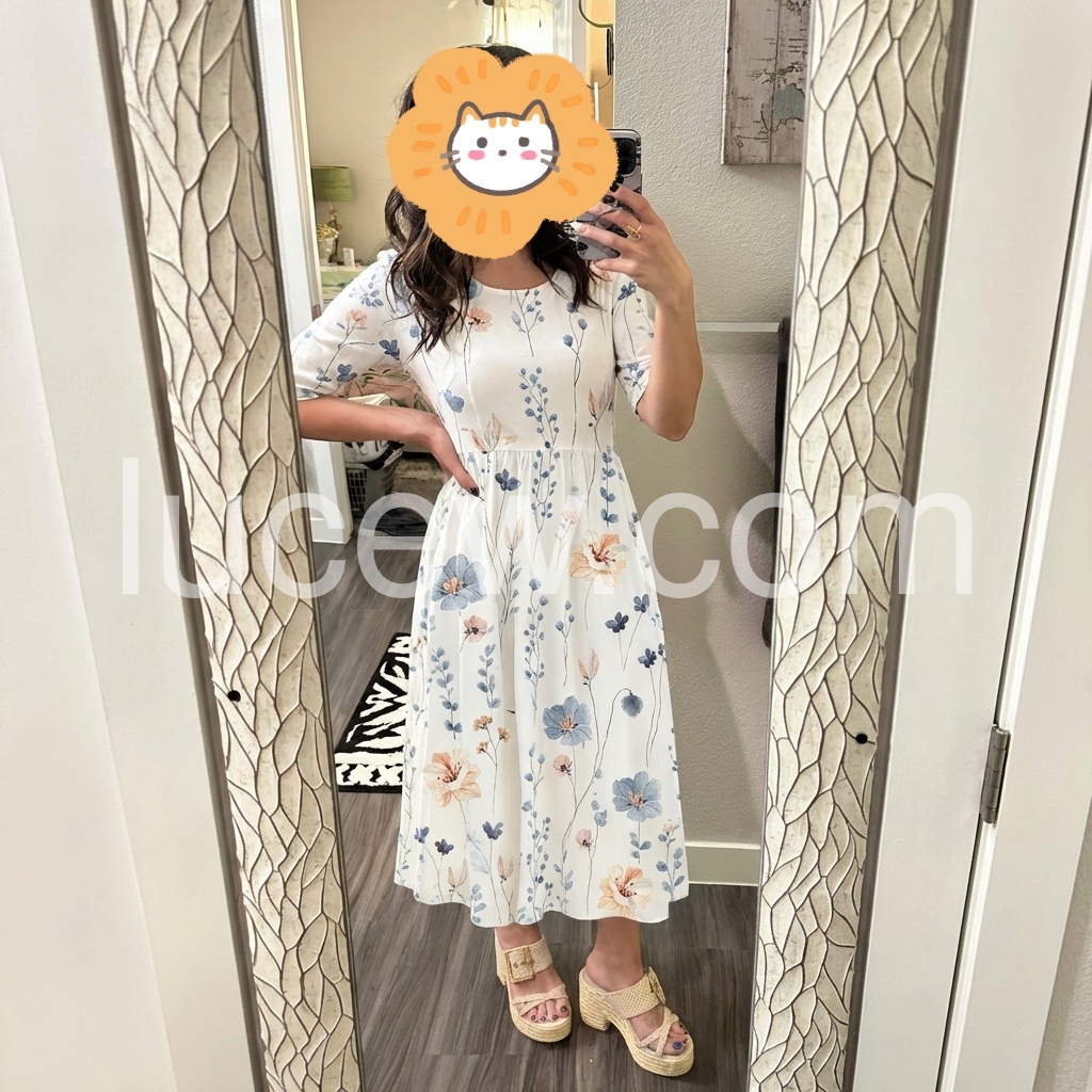 This is the perfect summer dress. The floral print is delicate and exactly as pictured. I appreciate the modest half sleeves and the midi length, which make it great for church or a casual brunch. Fits true to size.