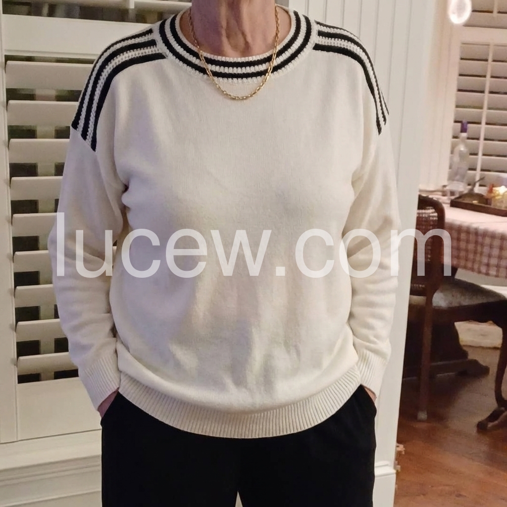This sweater is a perfect blend of comfort and style. The black-and-white striped neckline gives it a distinctive, classic look, and the plain white body makes it easy to pair with almost anything. The knit fabric feels smooth and cozy, and the fit looks really nice on. I’ve already recommended it to a friend!