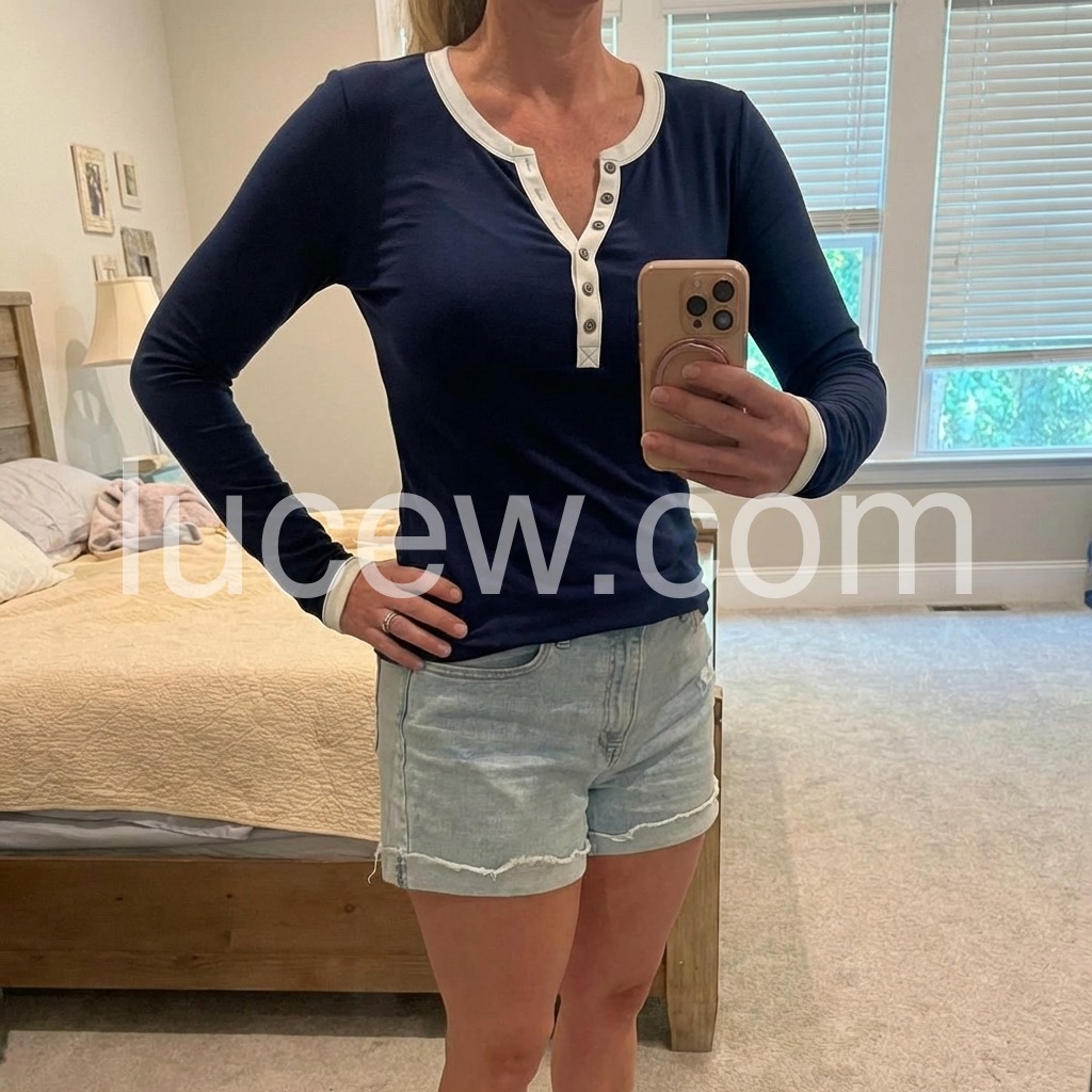 Elevate your everyday wardrobe with this navy long sleeve color block top, designed for versatile styling and modern appeal. The strategic color blocking creates visual interest while maintaining a polished aesthetic suitable for both casual and professional settings. Crafted with attention to detail, this piece offers comfortable wear throughout the day. The long sleeves provide practical coverage, making it an ideal layering option for transitional seasons. Perfect for those seeking quality basics that seamlessly integrate into any closet.