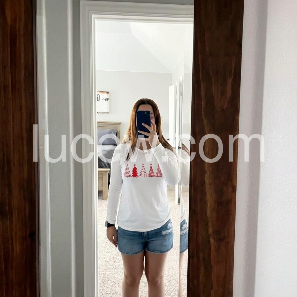 Celebrate the holidays in chic style with this casual Christmas top. A round collar and long sleeves with a waist-length fit make it perfect for layering with a cami underneath and your favorite jacket. A row of cute red Christmas trees gives it just enough holiday cheer, making it versatile enough to wear to work, out, or casually.