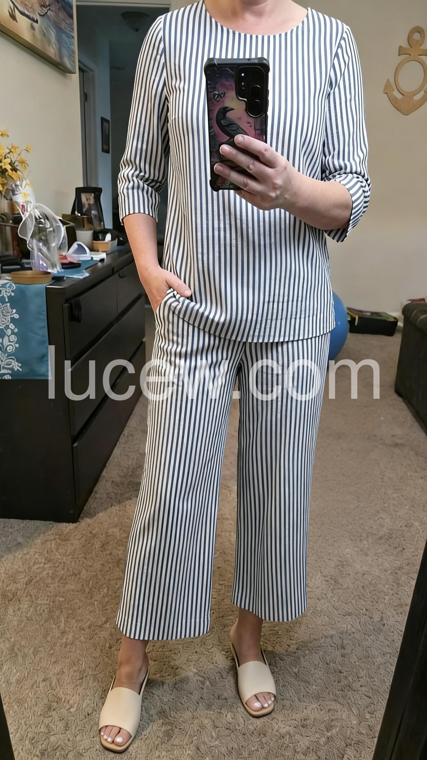 This coordinated set features a relaxed-fit top and wide-leg cropped pants in classic blue and white stripes. The three-quarter sleeves and round neckline offer a clean, timeless look. Lightweight fabric perfect for warm weather. Ideal for casual outings or smart-casual events. Effortlessly chic and easy to style.