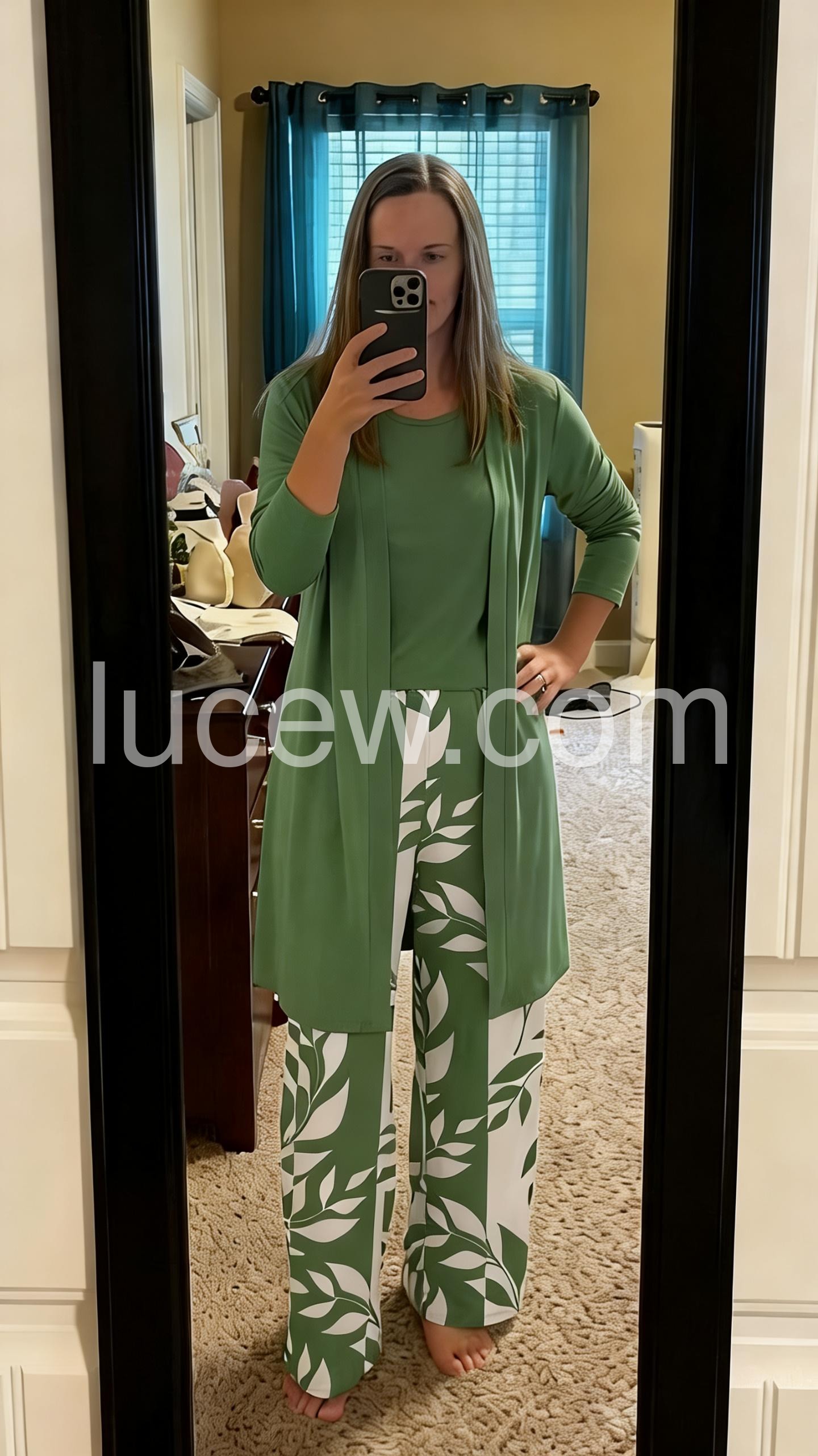 This three-piece set features leaf-patterned wide-leg pants in white and green, paired with a solid green top and open-front cardigan. The relaxed fit offers comfort and elegance. Perfect for casual outings or smart-casual events. Lightweight fabric ideal for warm weather. Effortlessly chic and easy to wear.