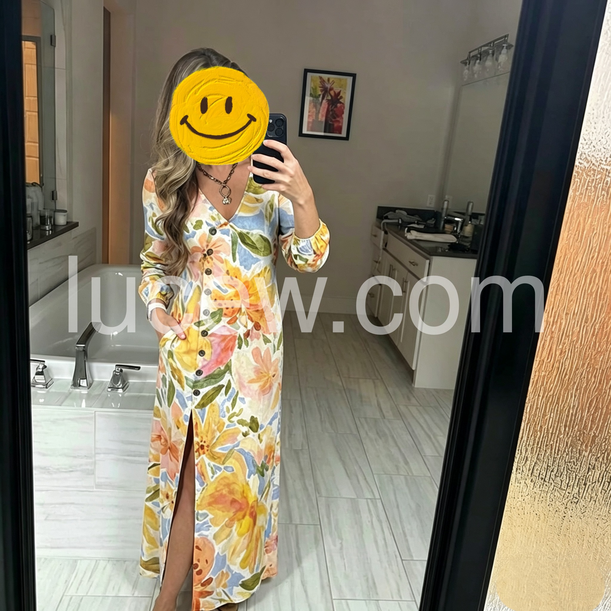 I am absolutely in love with the watercolor floral print of this dress! The colors are just as vibrant as the picture. The V-neck and button-down style make it very flattering, and the material is soft and flowy. Perfect for a spring wedding or a brunch date.