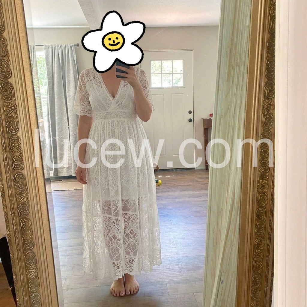The intricate white lace, V-neckline, and cinched waist create a dreamy, feminine silhouette, with pockets for everyday ease.