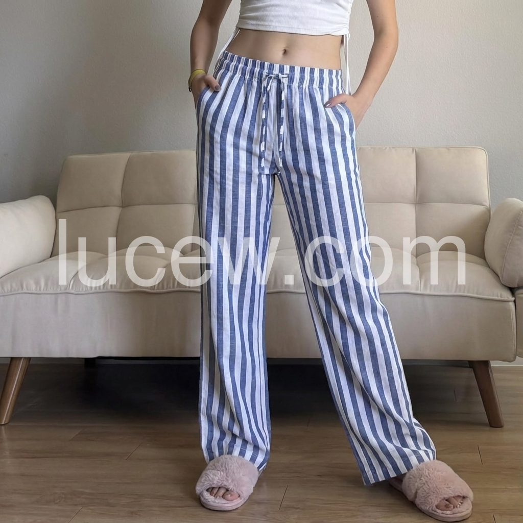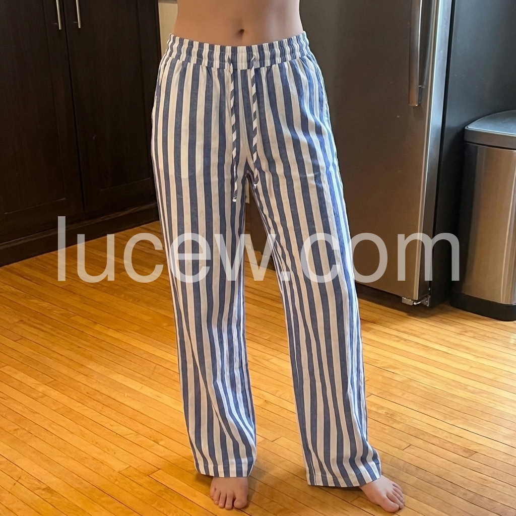 These relaxed-fit pants feature bold vertical stripes in navy and white. Elastic waistband with drawstring for comfort. Wide-leg design and lightweight fabric perfect for summer. Ideal for beach outings or casual wear. Effortlessly stylish and breezy.