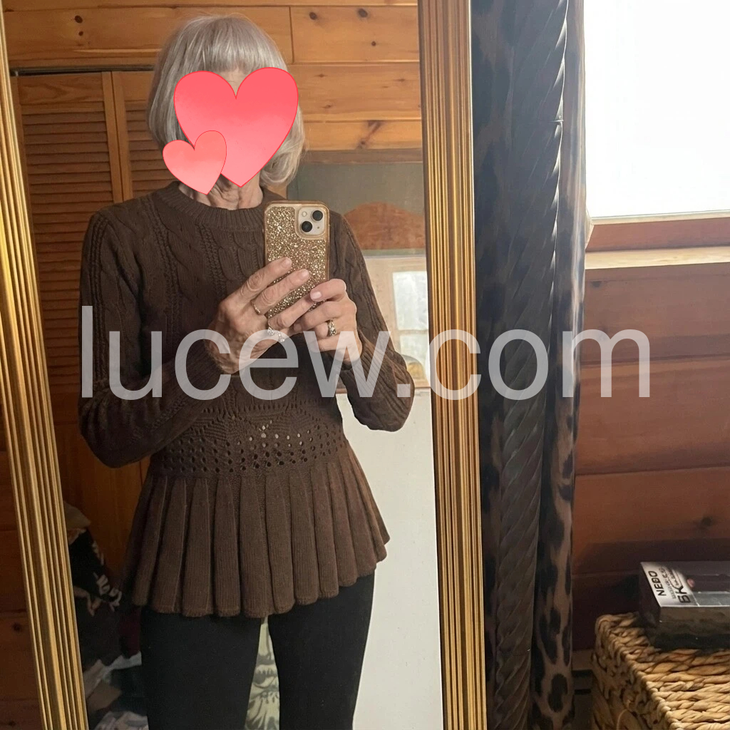 I absolutely love this sweater. The cable texture is gorgeous and the color is so flattering. The peplum bottom gives it a really nice shape without being bulky. It feels soft and comfortable, and the fit looks great. Looks exactly like the photos and the quality is excellent.