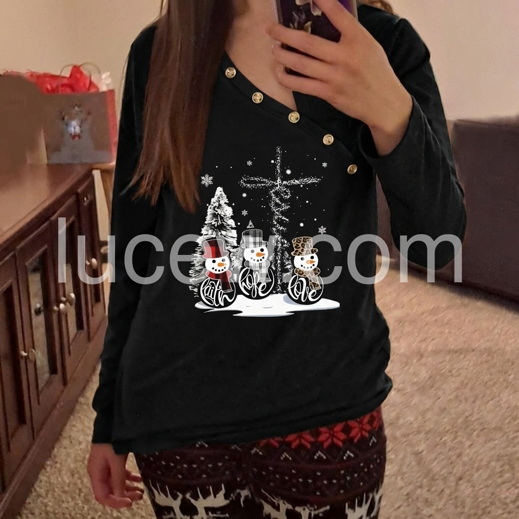 Add this cozy long sleeve top to your winter wardrobe, featuring adorable snowmen and a Cross, a Christmas tree, and falling snowflakes that set the stage for a super-fun holiday party, Christmas vacation, and so much more. An asymmetrical button front collar gives it a contemporary vibe.