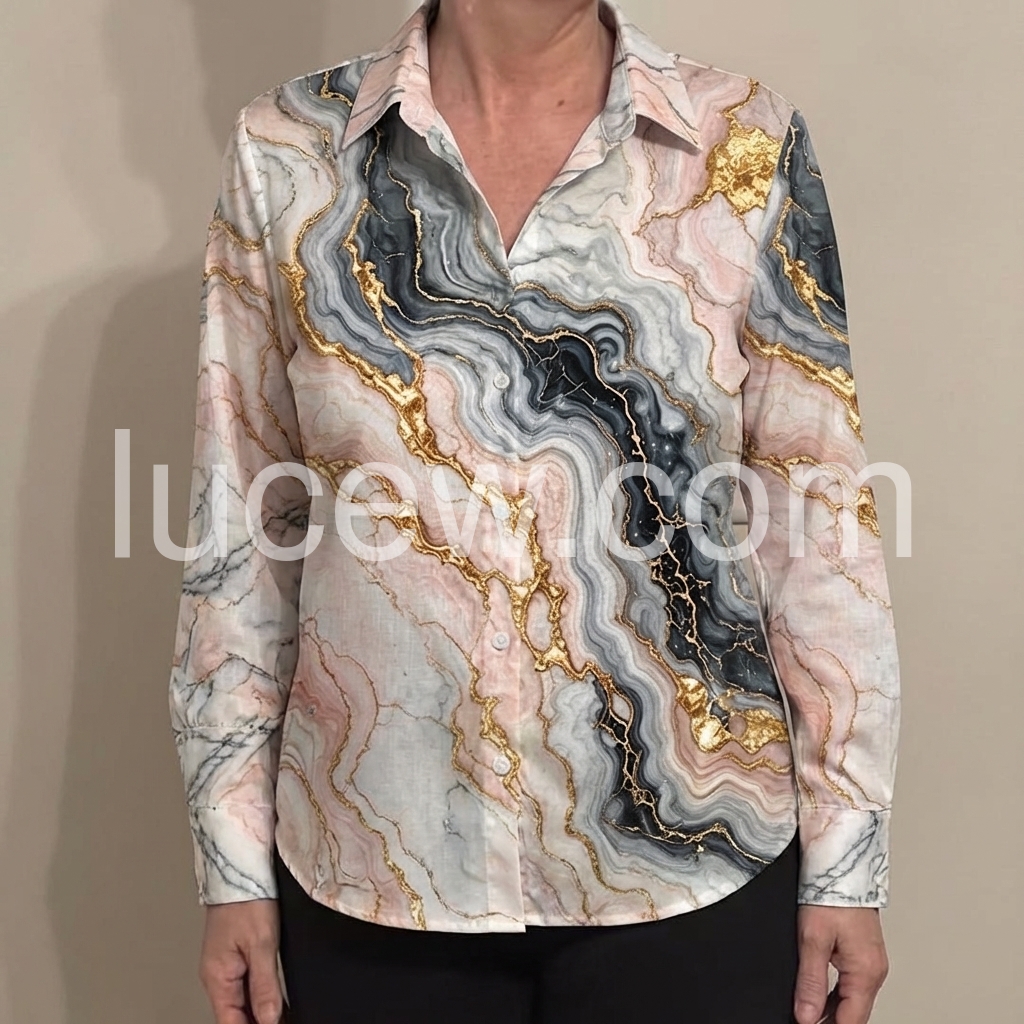 This shirt is a luxury statement piece with a marble and gold print.