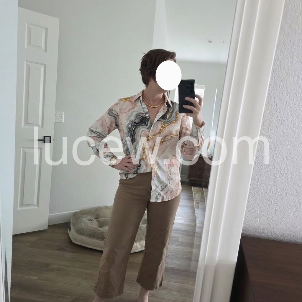 Stunning shirt! The pink and grey marble effect is gorgeous. It is surprisingly versatile, I have worn it with black slacks for a meeting and with distressed jeans for a date night. Love it!