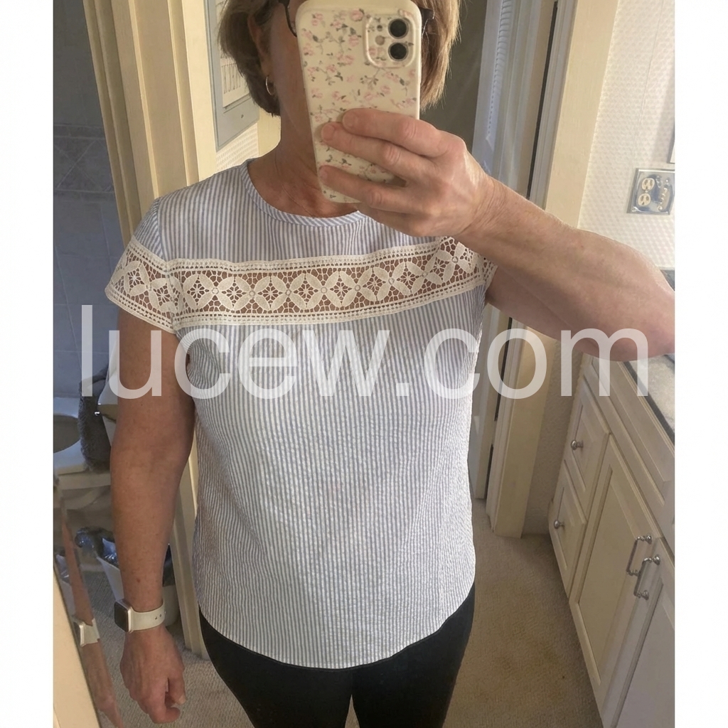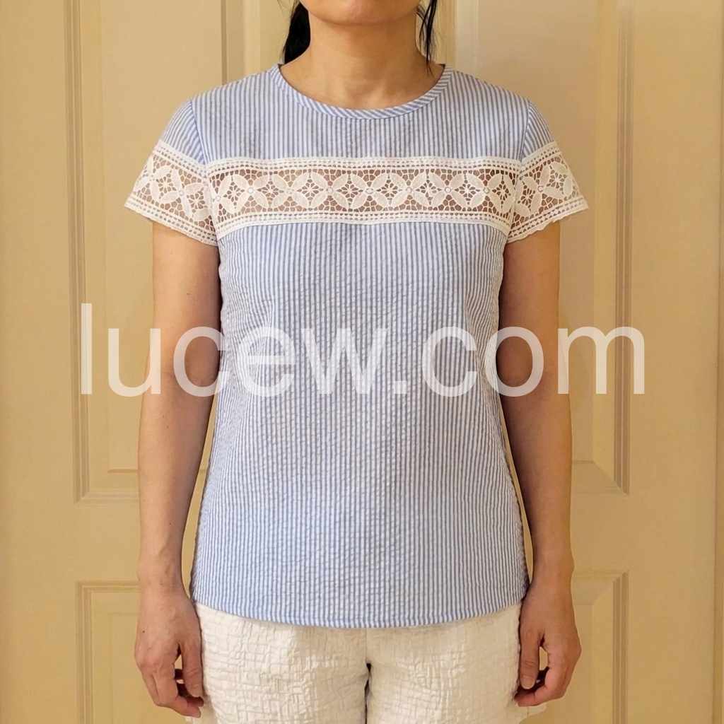 This short-sleeve top features a delicate white lace panel across the chest and sleeves. Made from soft, textured fabric with vertical stripes for a subtle pattern. Perfect for casual summer days or beach outings. Pair with shorts or jeans for a stylish look. Effortlessly chic and breathable.