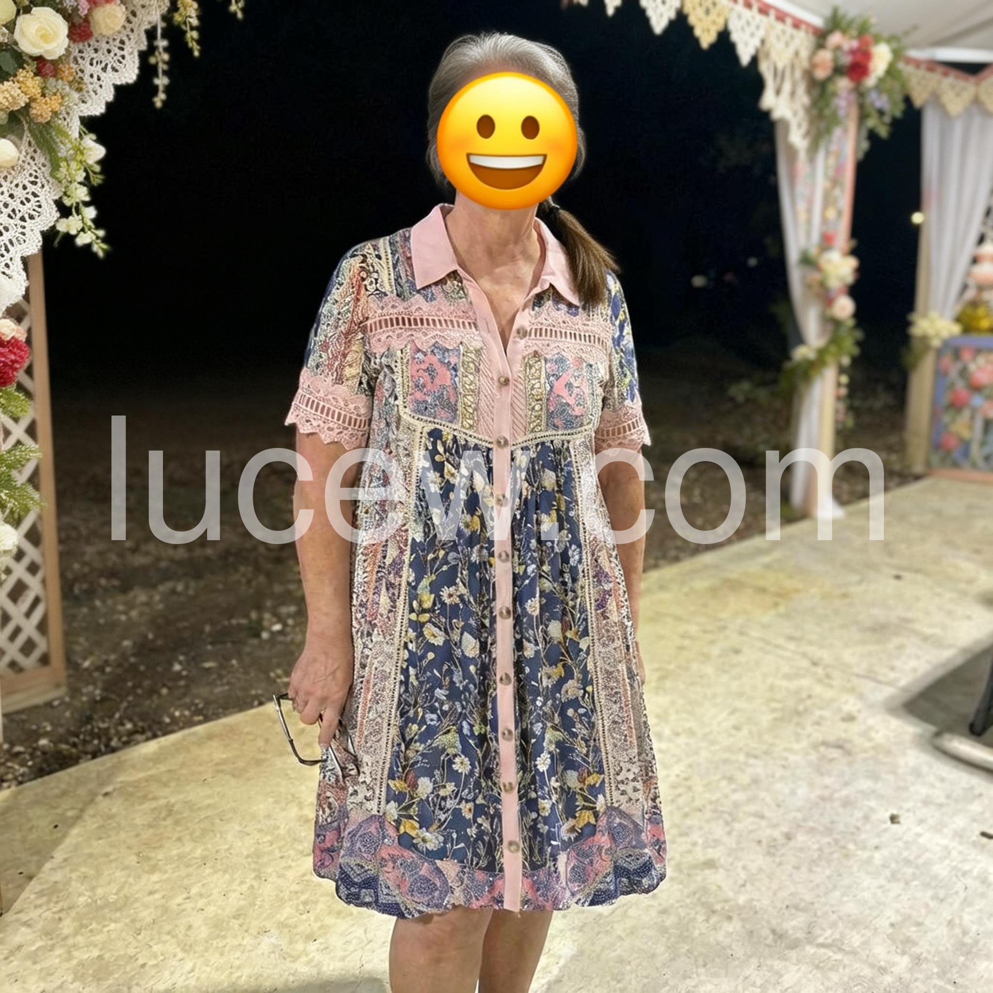 Love the functional buttons down the front. Makes it super easy to put on and take off. The pink collar is a cute contrast to the blue floral skirt part. Runs exactly as the sizing chart says.