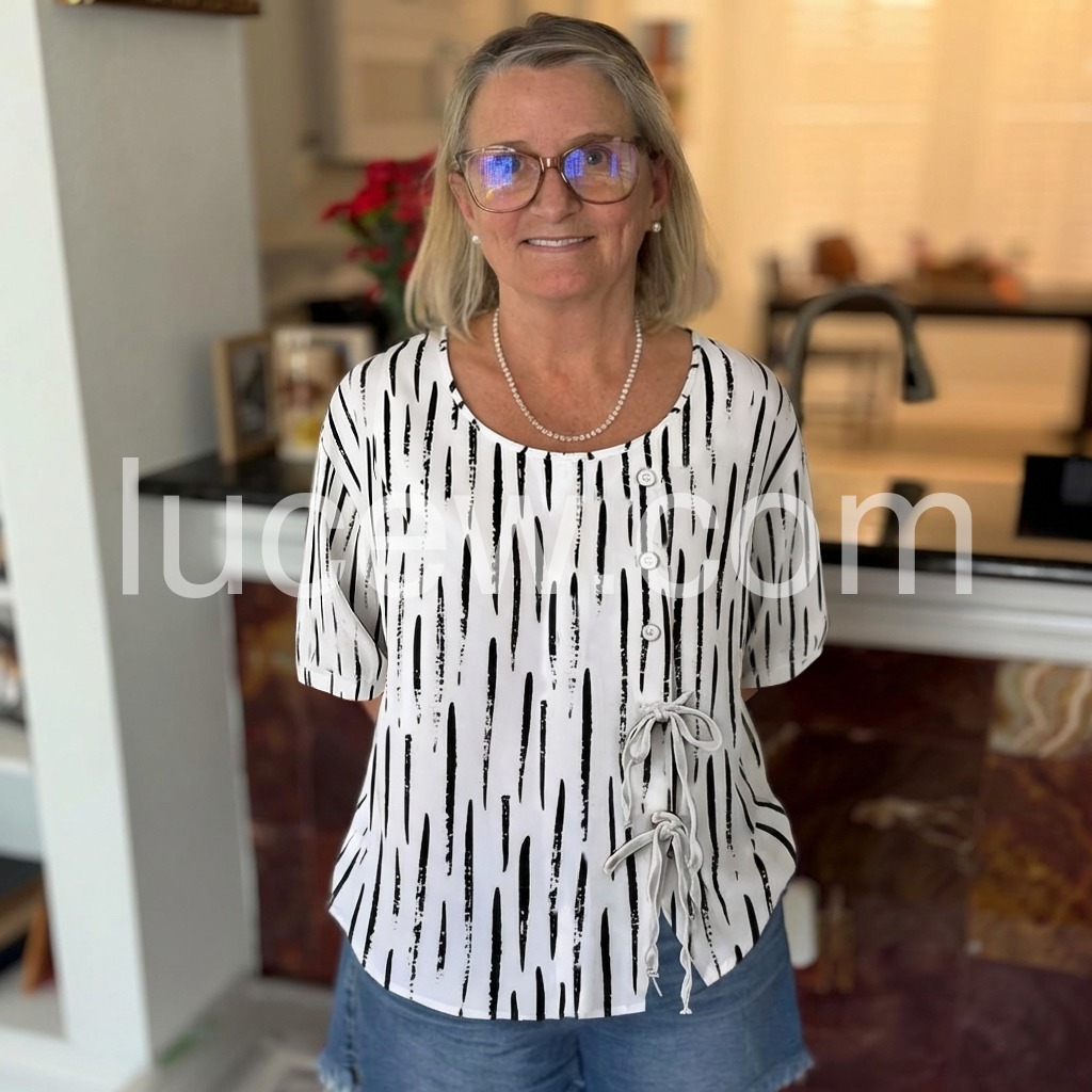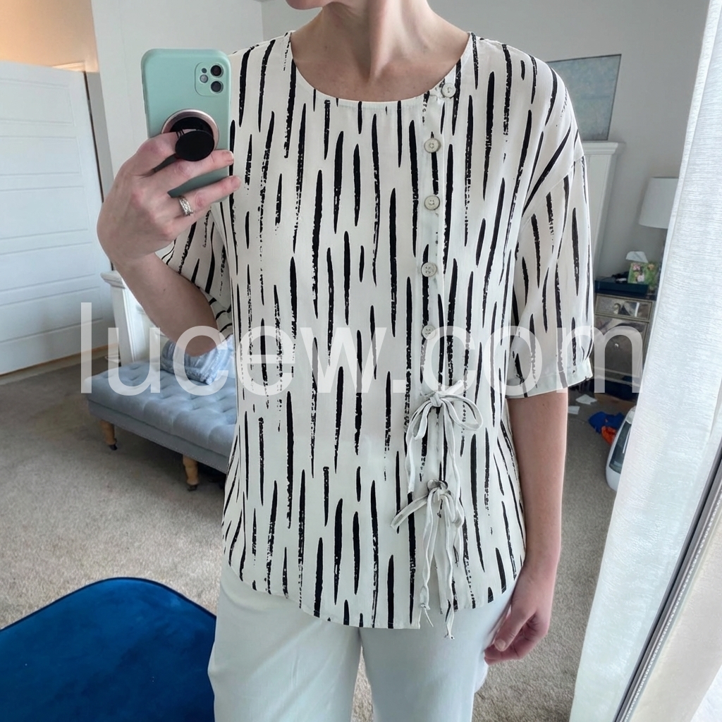 This relaxed-fit blouse features a bold black abstract stripe print on a white base. Round neckline with front button closure and side tie details. Lightweight fabric perfect for everyday wear. Ideal for pairing with jeans or leggings.