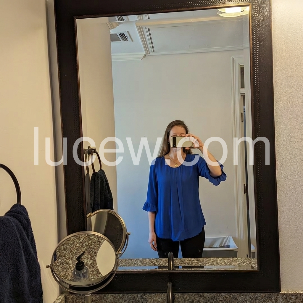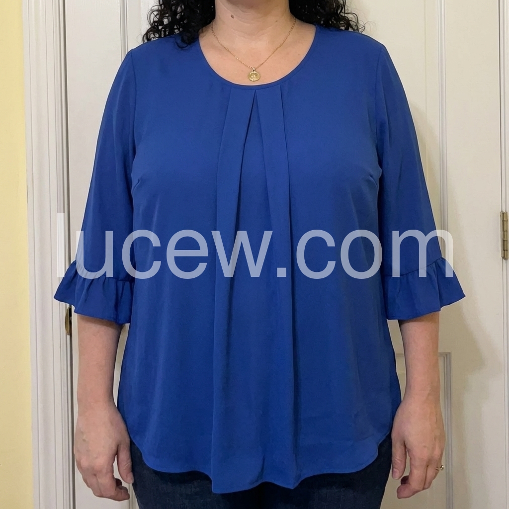 Love the ruffle 3/4 sleeves! It is perfect for the office but looks great paired with jeans too. Very versatile top.
