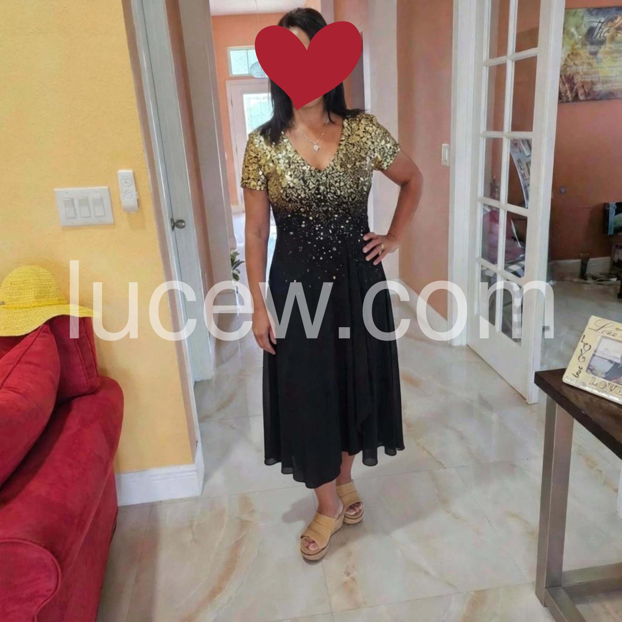 This elegant V-neck midi dress combines sophisticated design with practical comfort. The short sleeves offer versatility for various occasions, while the flattering V-neckline enhances your neckline. The midi length provides a balanced silhouette suitable for both professional settings and social gatherings. Crafted with attention to detail, this stunning dress will become a cornerstone piece in your wardrobe rotation.
