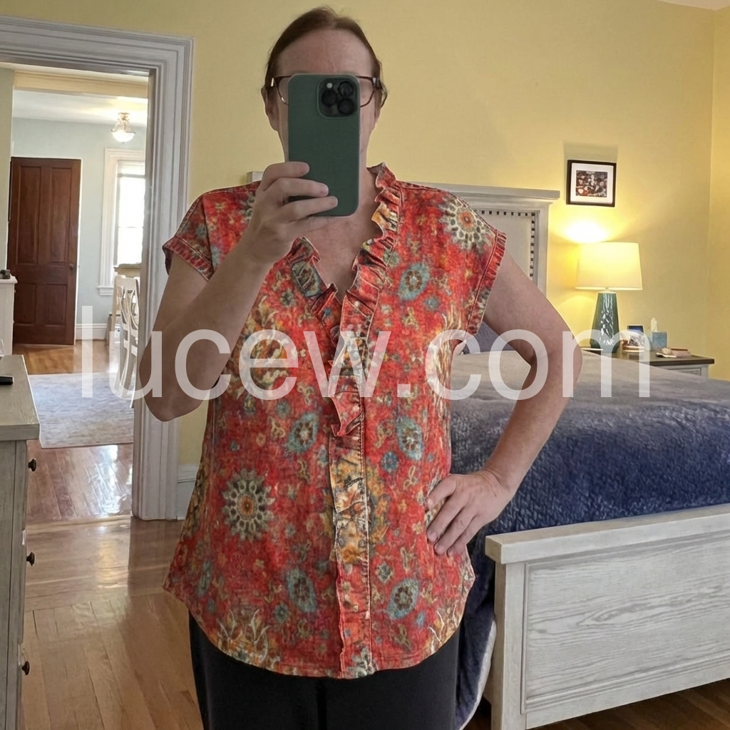 Absolutely fantastic top! The fit is spot on and the ruffled V-neck is super flattering. I love the vintage, faded look of the red background mixed with the bright blue and yellow floral accents. It is my go-to shirt when I want to look put together but remain comfortable.