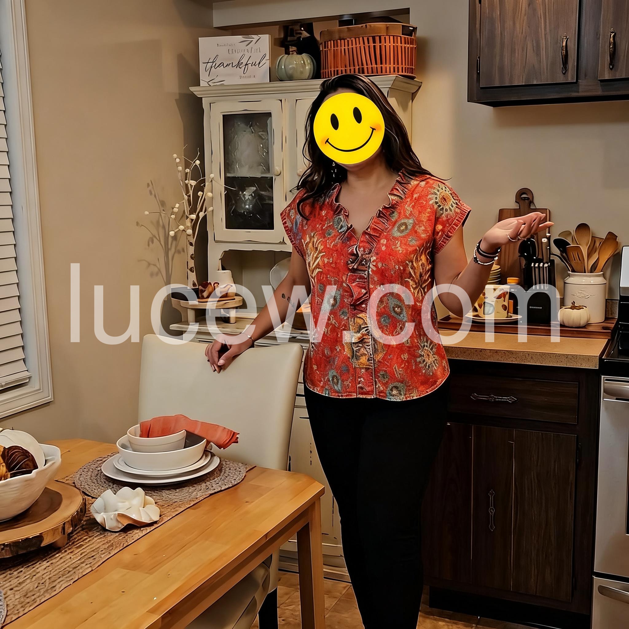 This Short Sleeve top features a rich red base with intricate mandala and floral patterns. The ruffled V-neckline adds a feminine, bohemian flair. Lightweight fabric drapes softly for a relaxed fit. Perfect for pairing with white jeans or denim shorts. Ideal for summer days with a touch of global style.