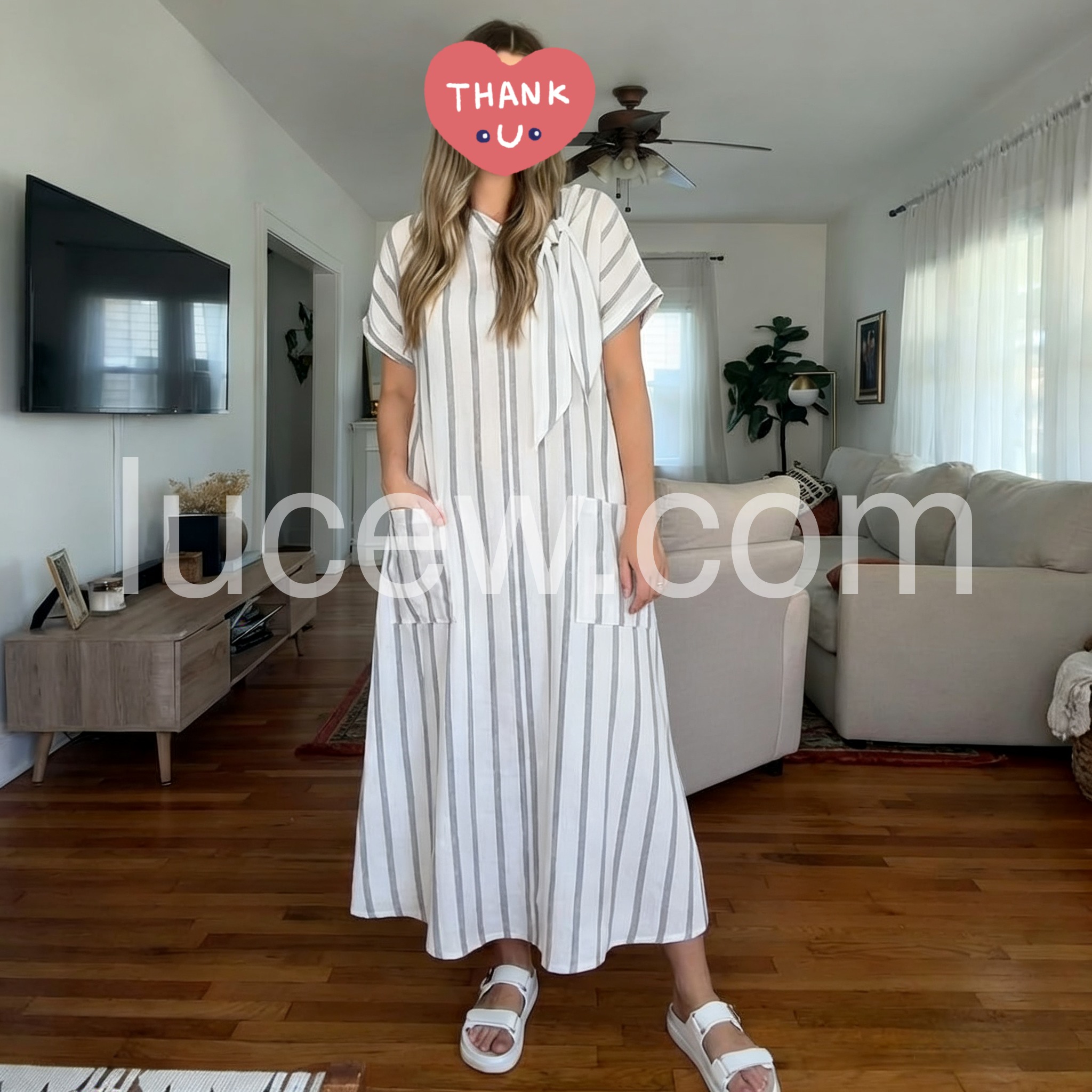 Gray White Stripe Tie Neck Pocket Maxi Dress