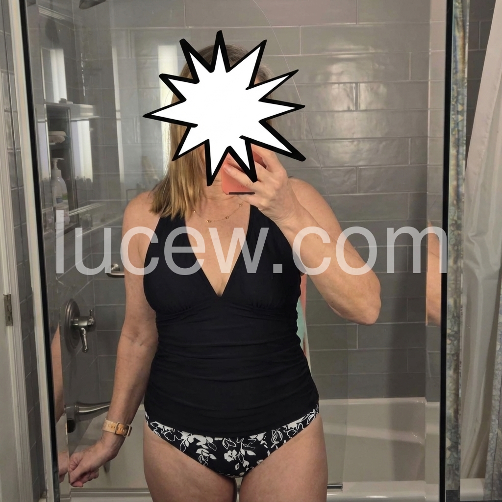 I like this suit a lot. It's comfortable and it masks my belly a bit. I tried a bunch of one pieces but they're all tight and emphasized the belly while making my backside look flatter than it is. Two piece suits are great and preferable when it's hot out.