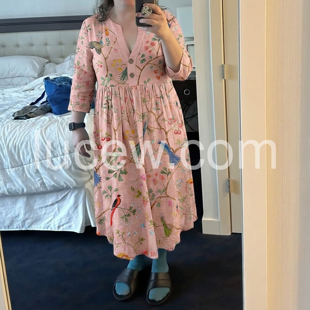 This three-quarter sleeve dress features a soft pink base with colorful birds and floral patterns. The V-neck and button front add vintage appeal. Side pockets offer comfort and convenience. Lightweight fabric perfect for spring and summer. Ideal for casual outings or garden parties.