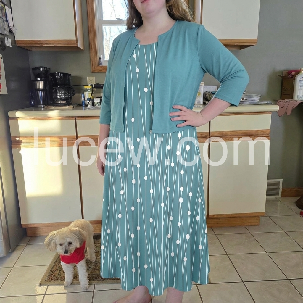 Such a beautiful dress set! The vertical lines really help to elongate the figure, and the little polka dots add a fun, playful touch. The jacket fits perfectly over the dress without looking bulky. I washed it on delicate and hung it to dry, and it came out looking brand new.